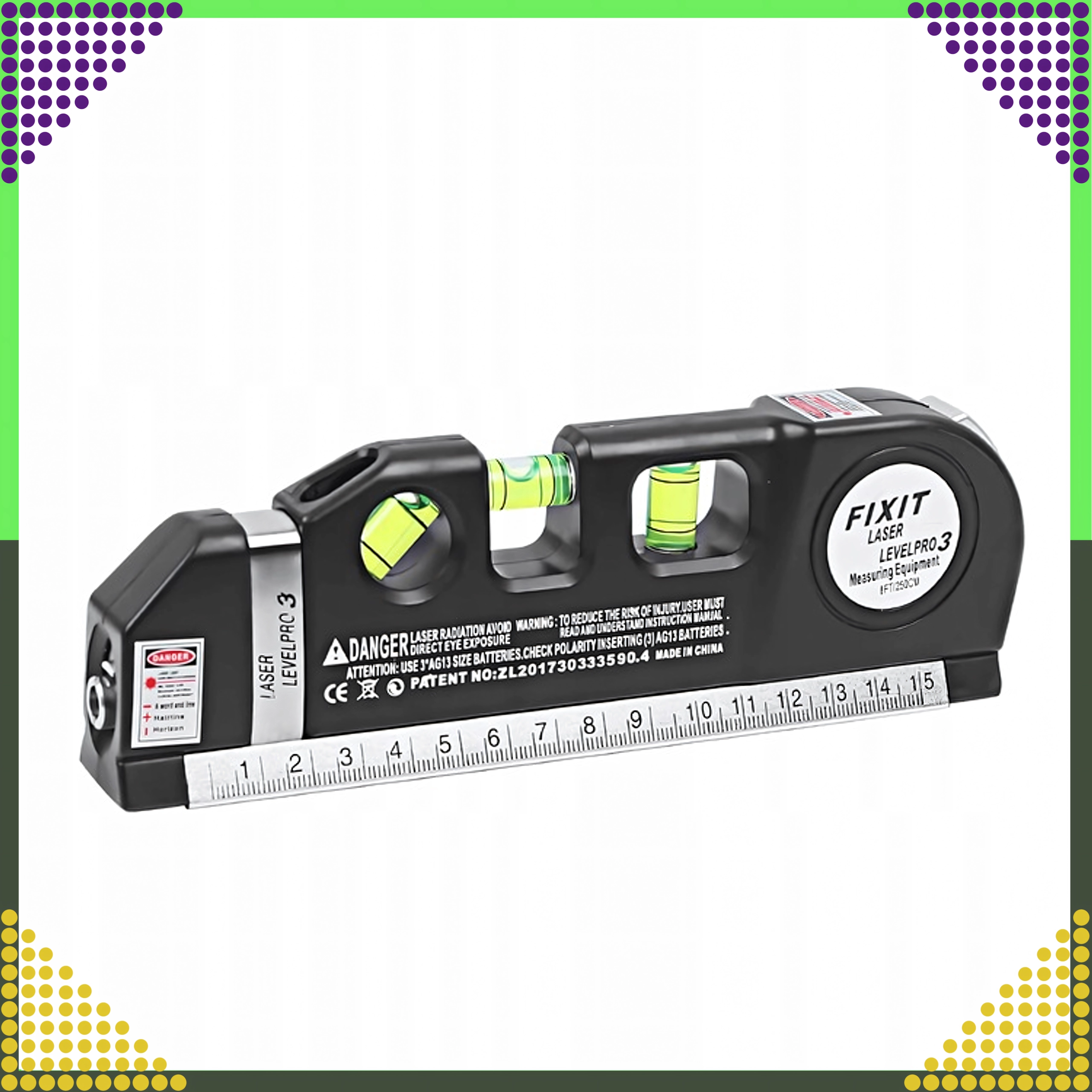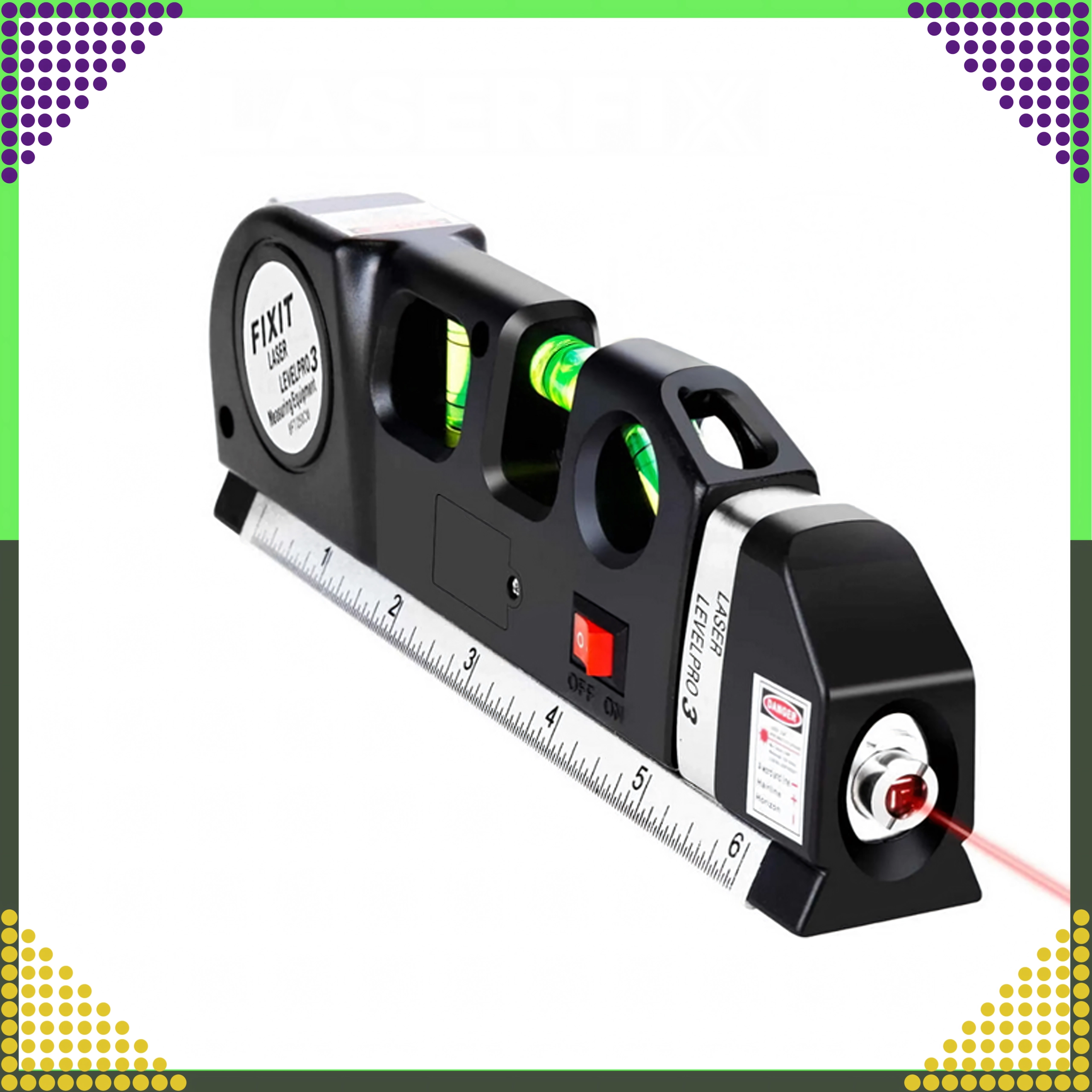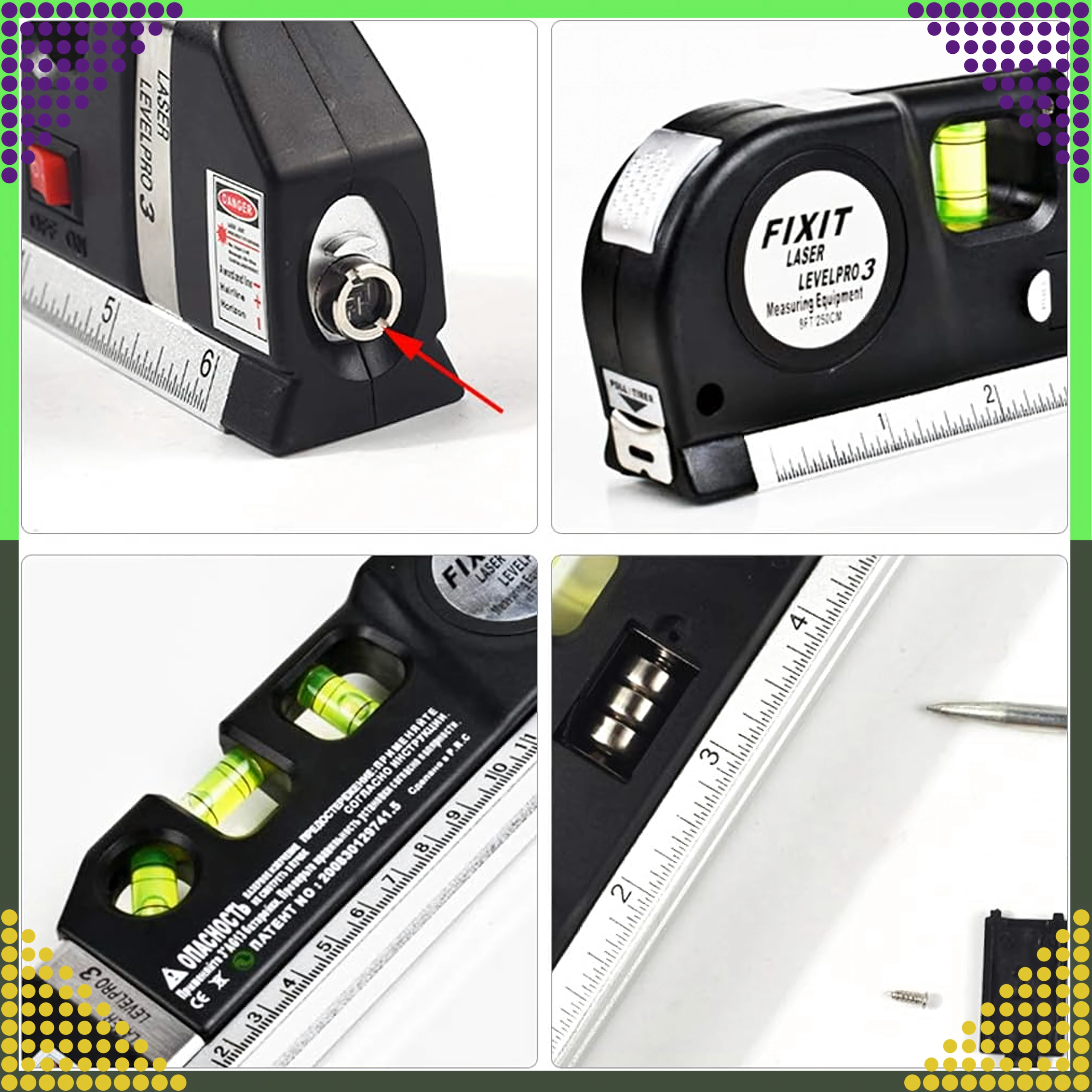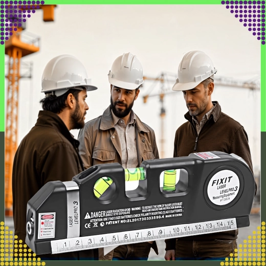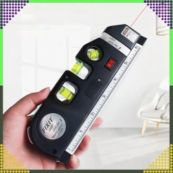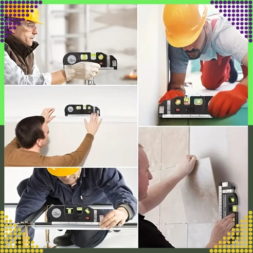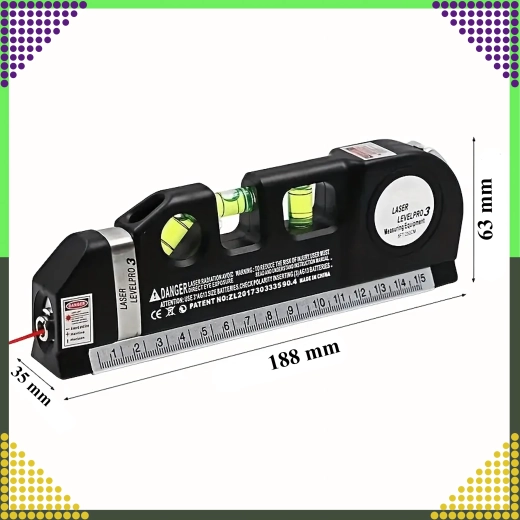 De veelzijdige tool combineert meerdere functies in één: een laserlijn voor snelle uitlijning, 3 nauwkeurige libellen (horizontaal, verticaal en 45°) en geïntegreerde meting zonder extra gereedschap. De meegeleverde LR44-batterijen laten je direct na het uitpakken beginnen.