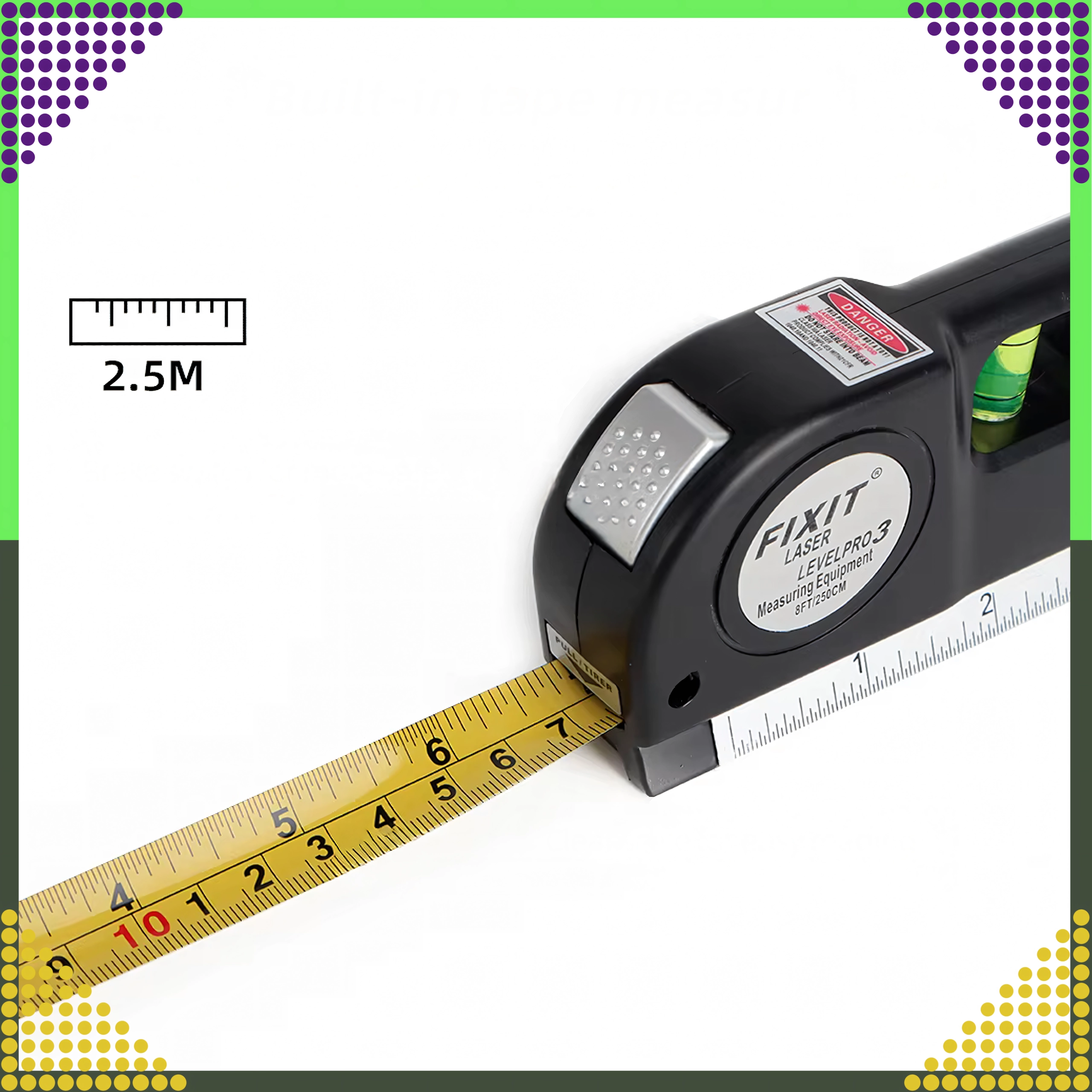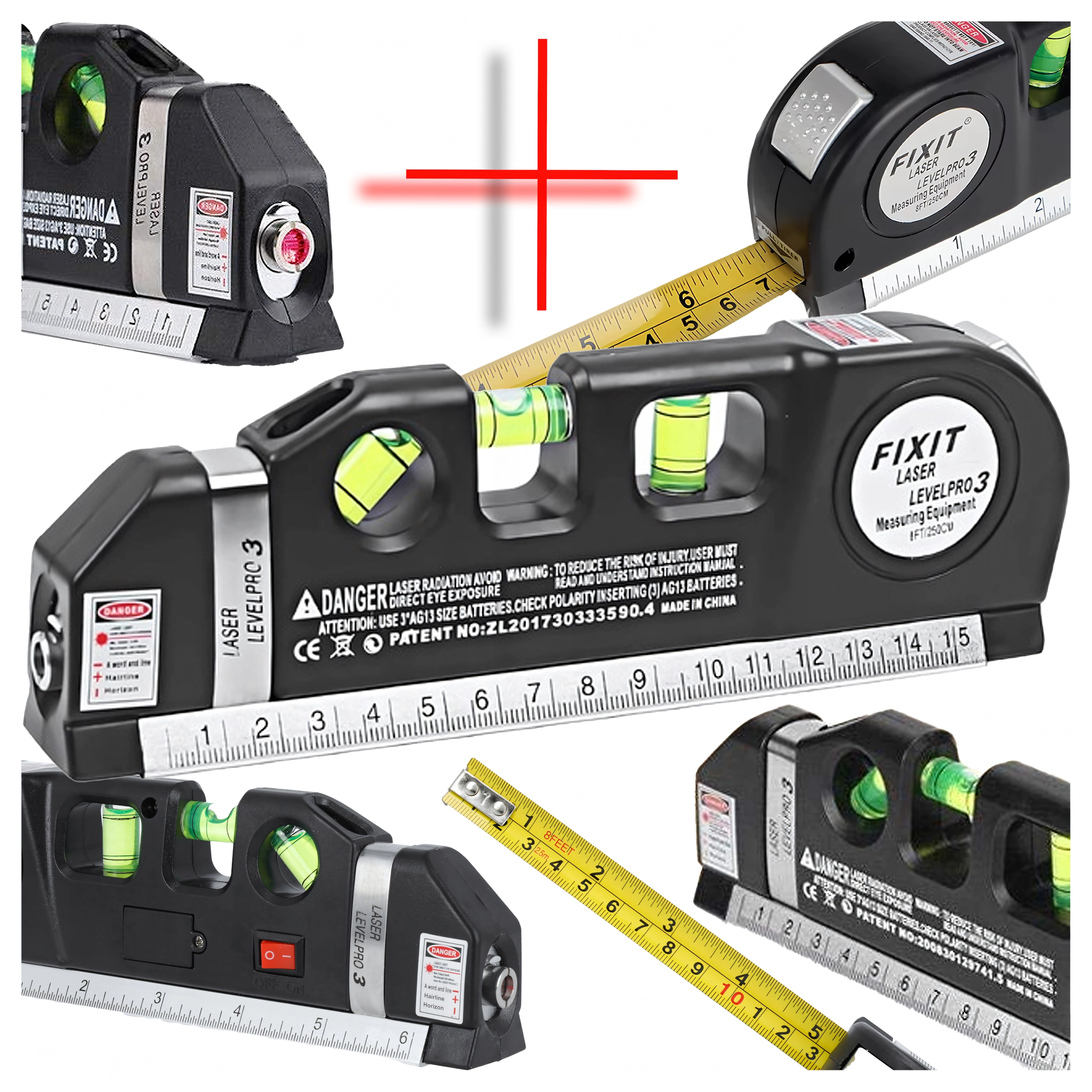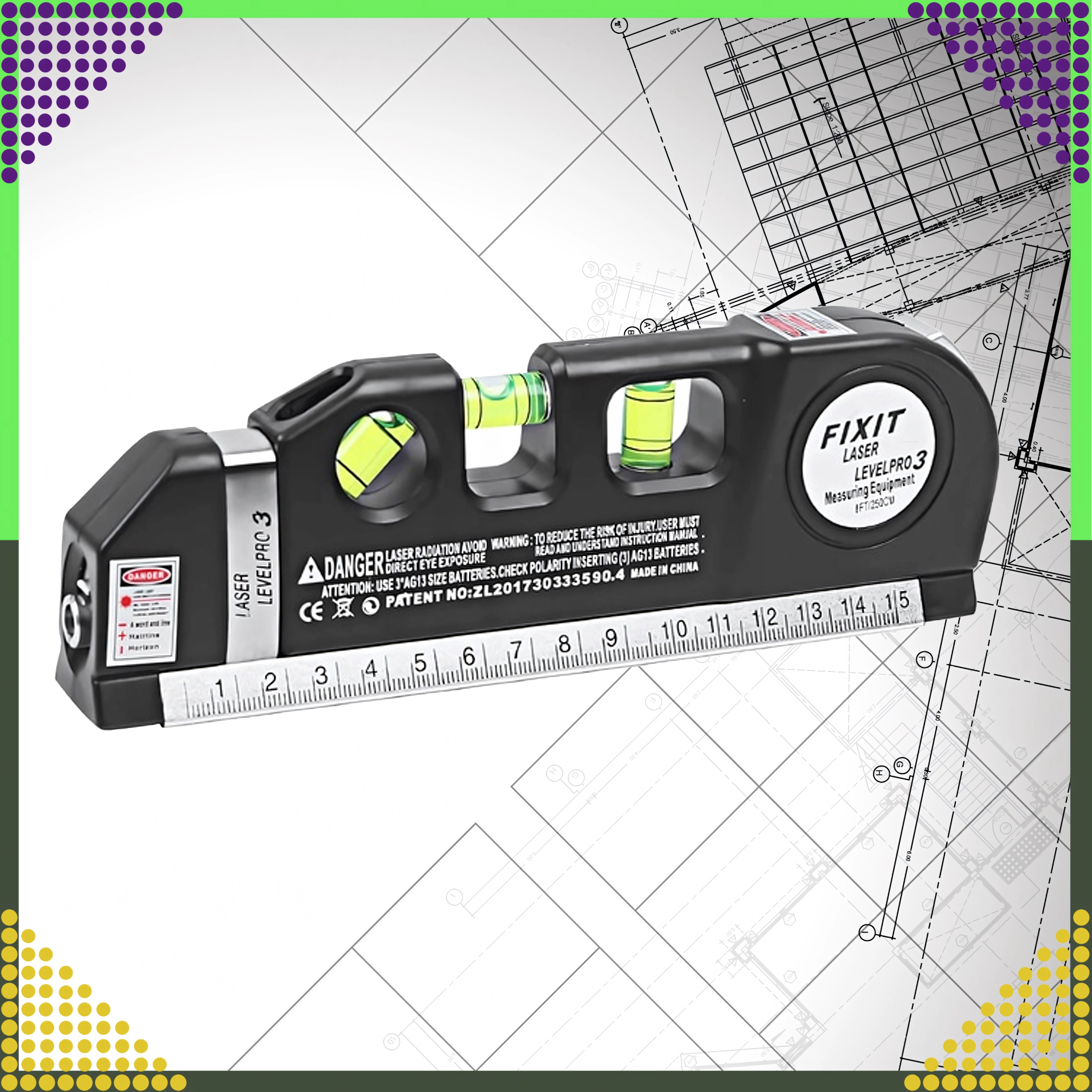 De veelzijdige tool combineert meerdere functies in één: een laserlijn voor snelle uitlijning, 3 nauwkeurige libellen (horizontaal, verticaal en 45°) en geïntegreerde meting zonder extra gereedschap. De meegeleverde LR44-batterijen laten je direct na het uitpakken beginnen.