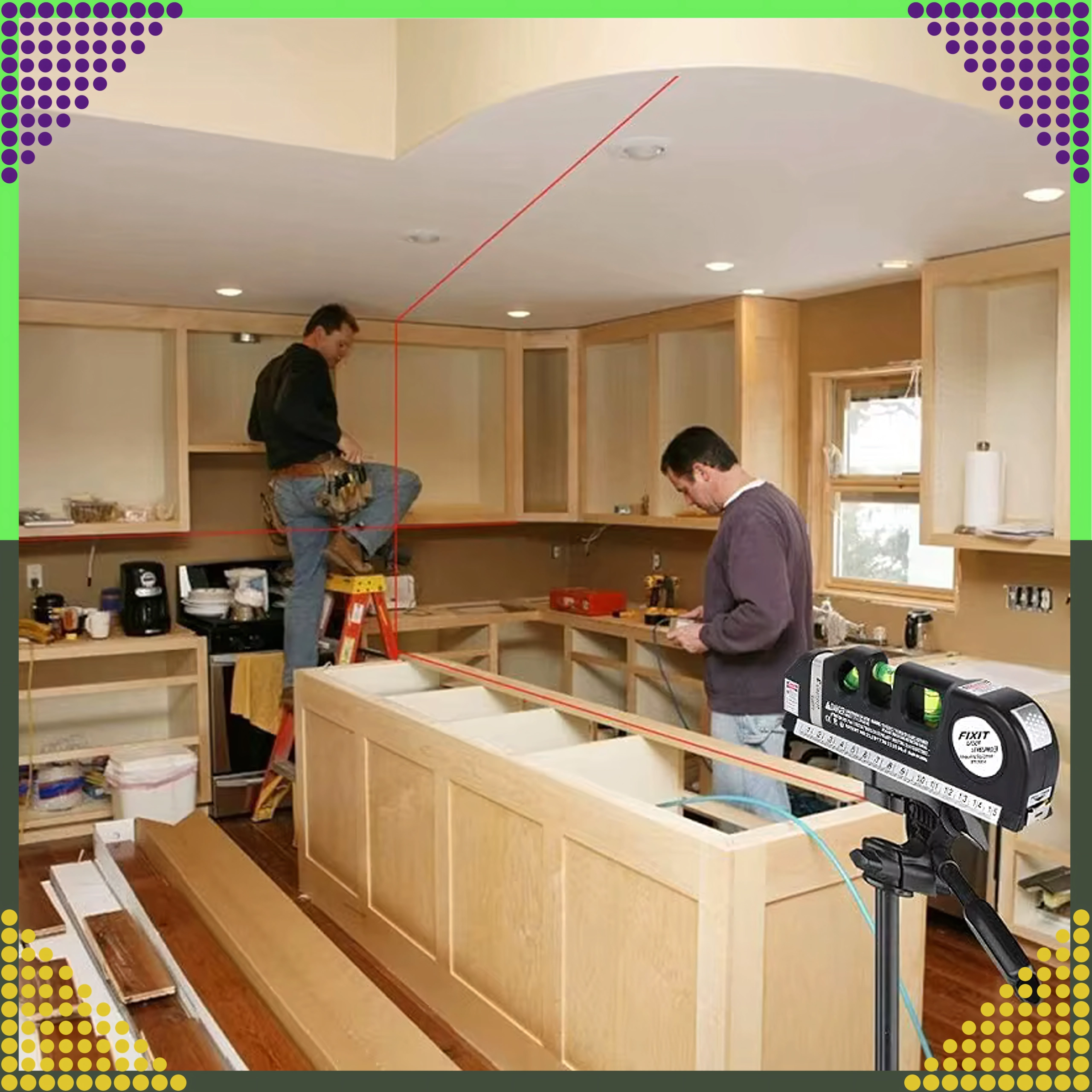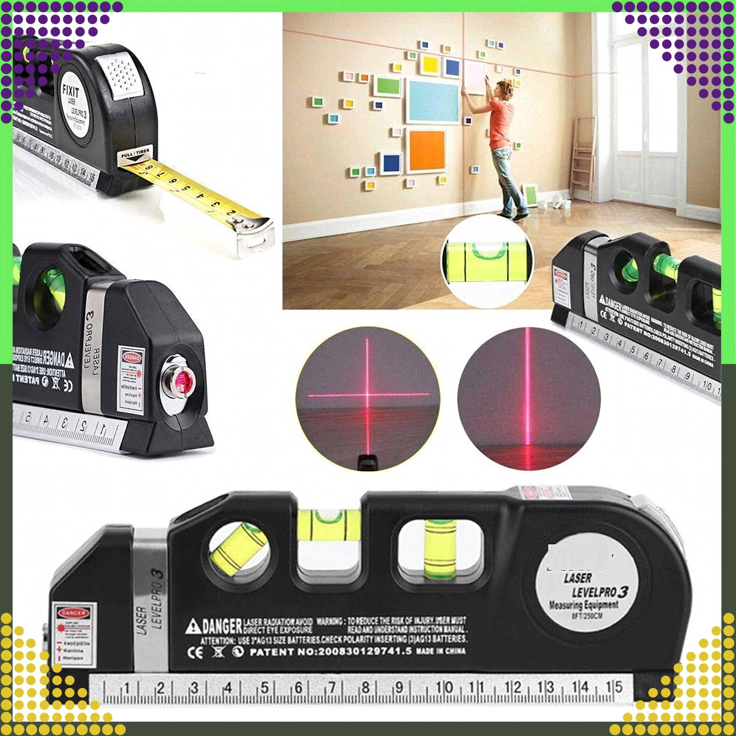 Projectie van een heldere horizontale en verticale lijn helpt frames, planken of tegels eenvoudig en correct te plaatsen.