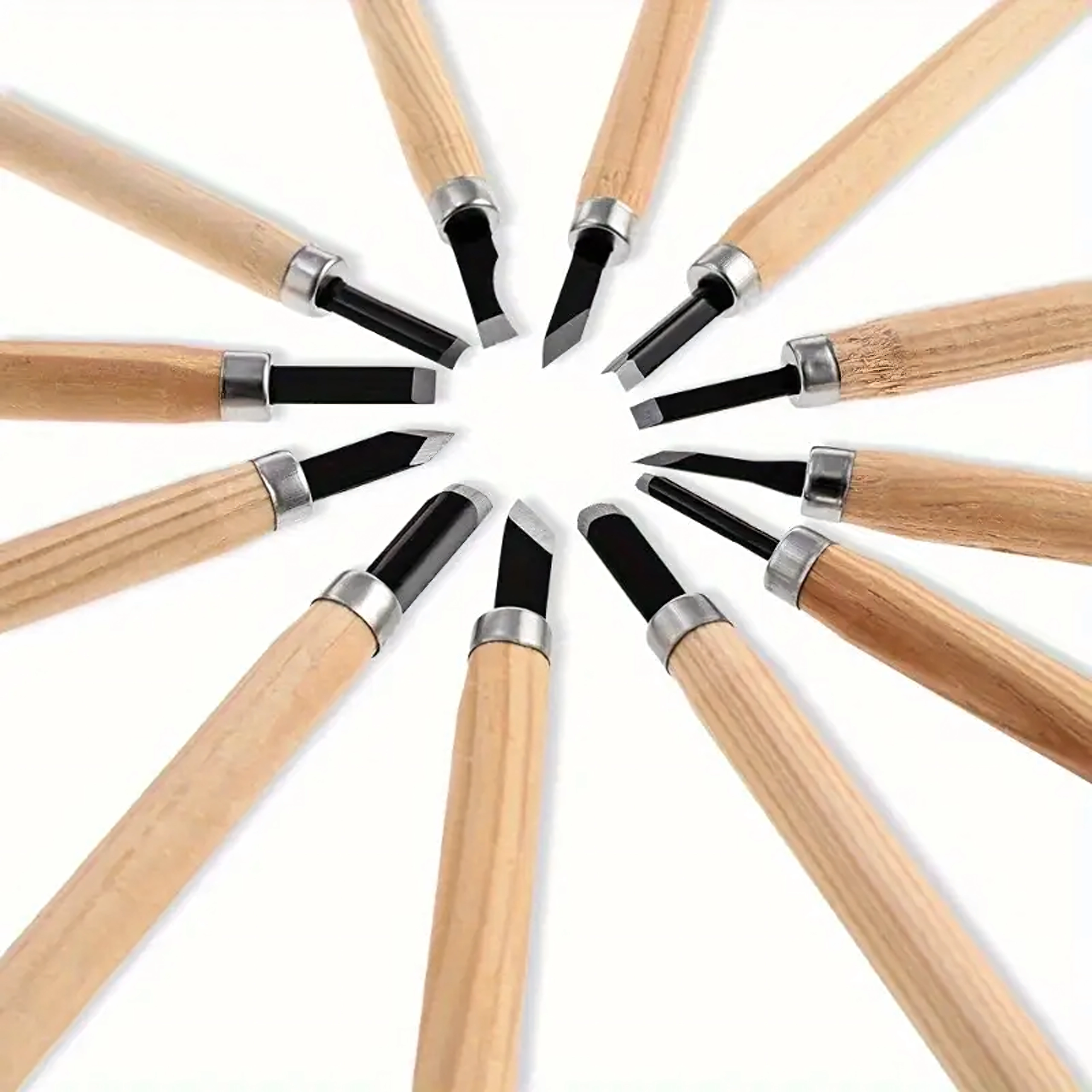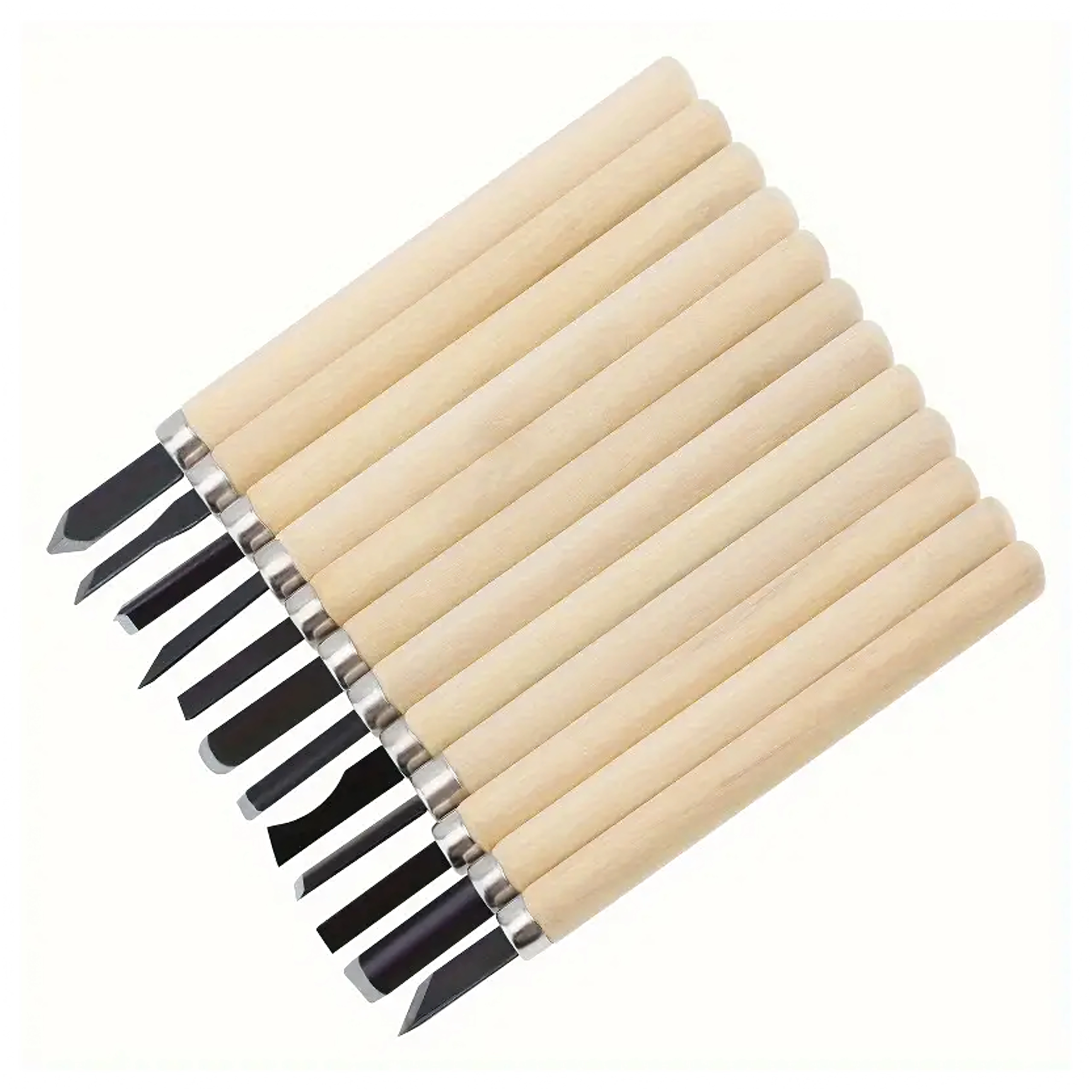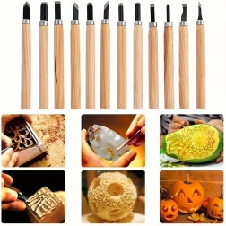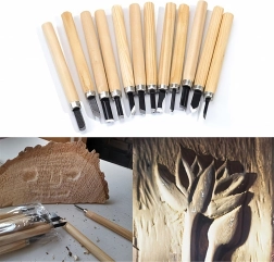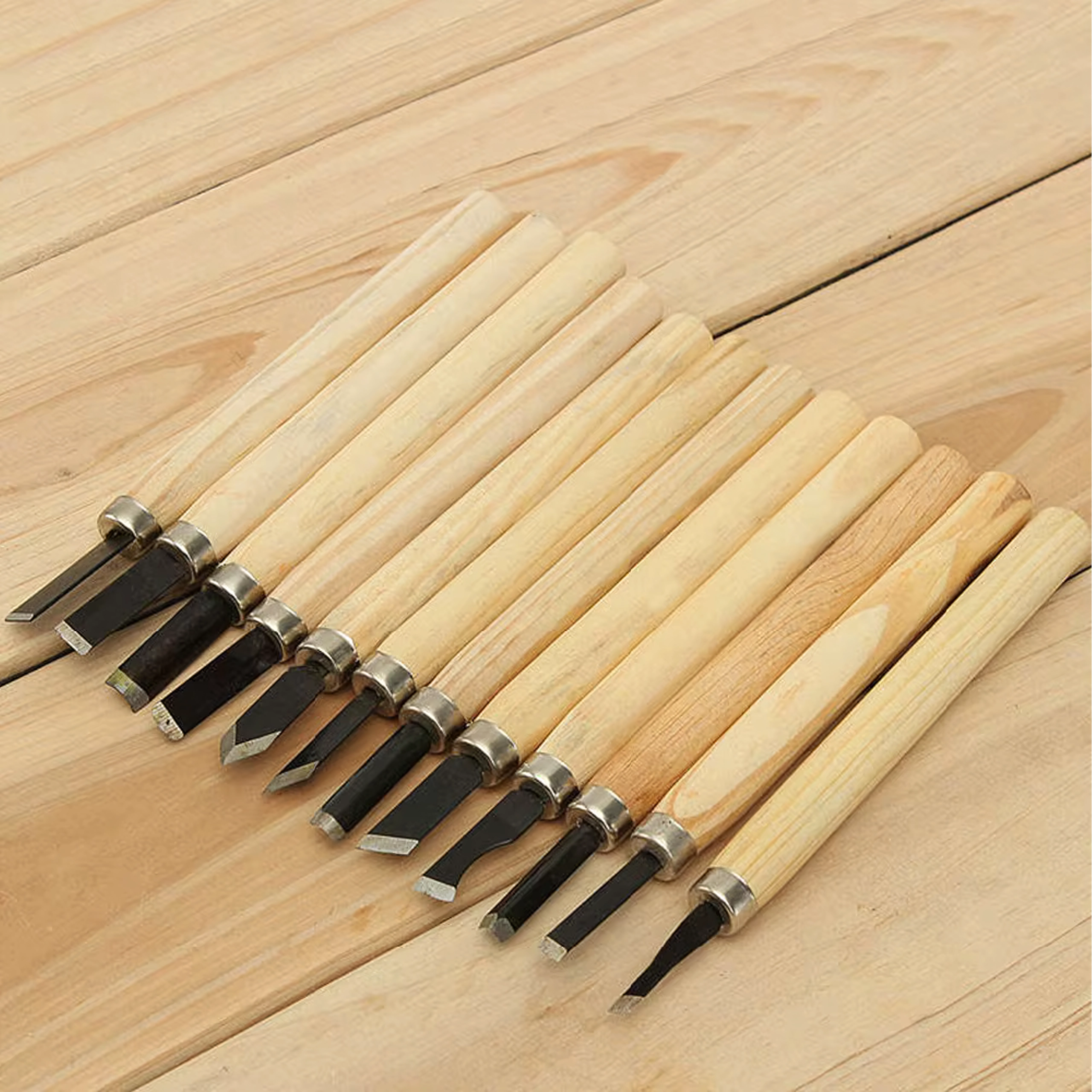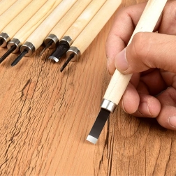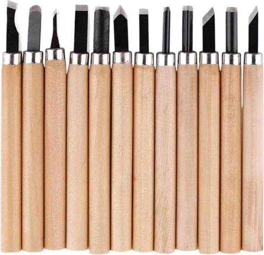De set bevat platte, V- en U-gutsen voor details, uithollingen en vlak materiaalafname – alles wat u nodig heeft voor houtsnijprojecten.