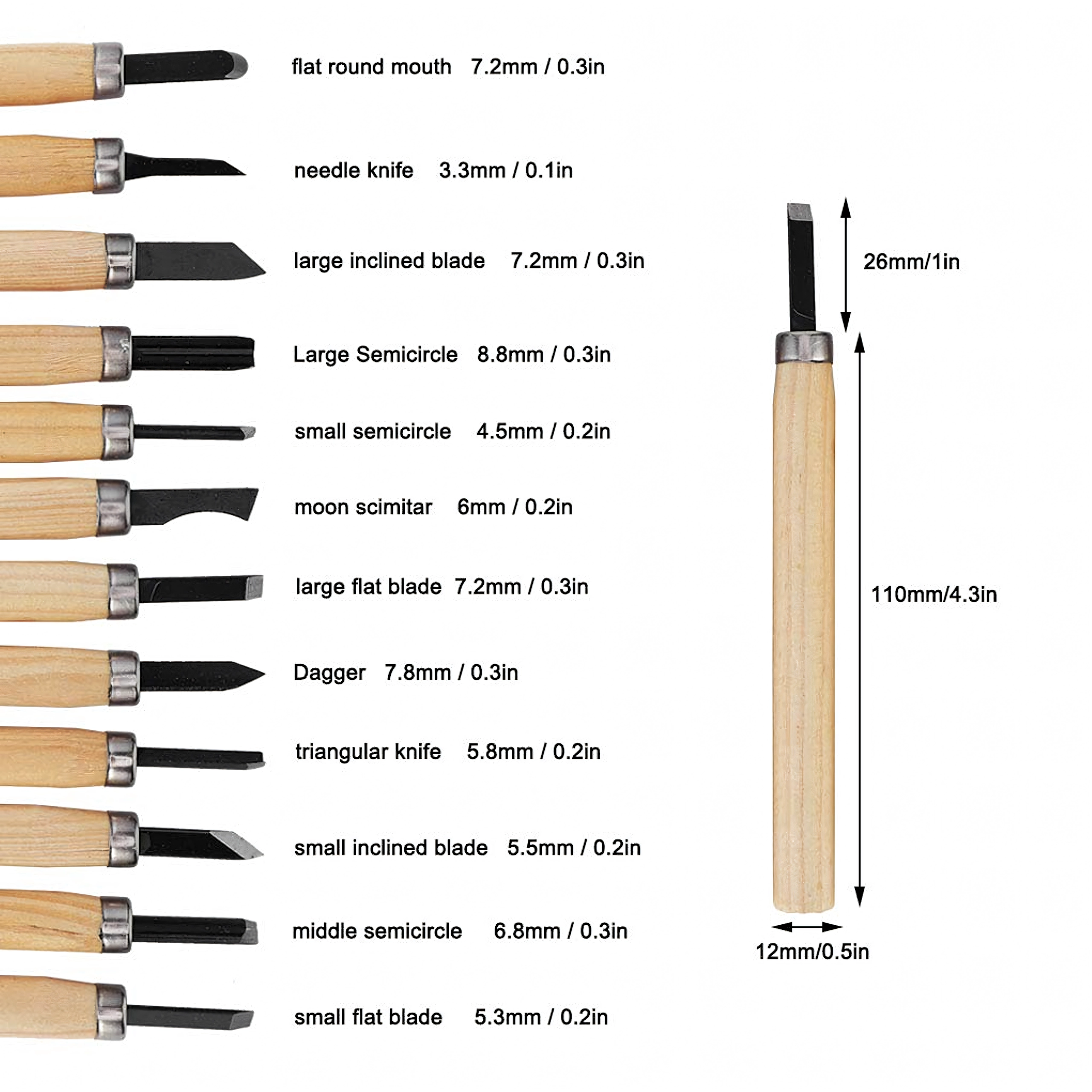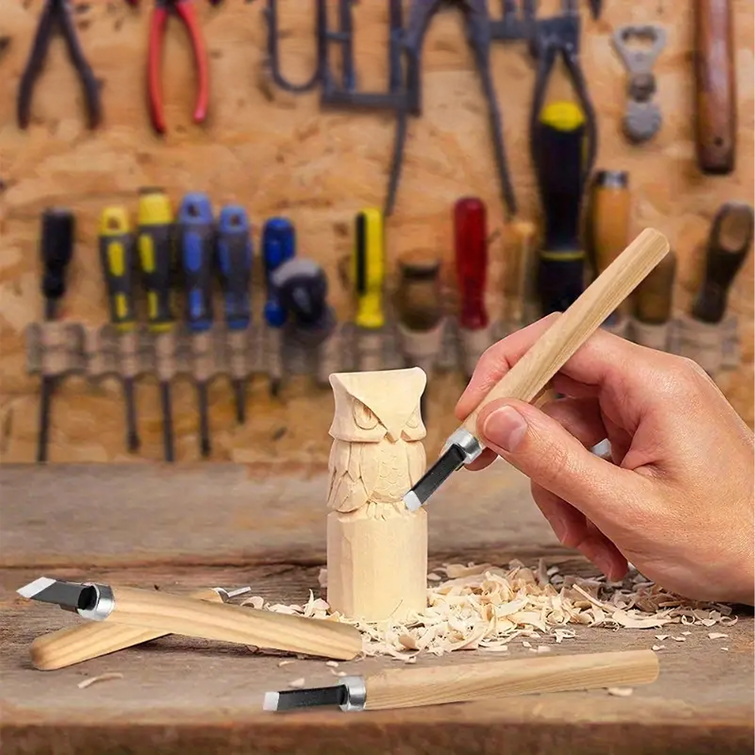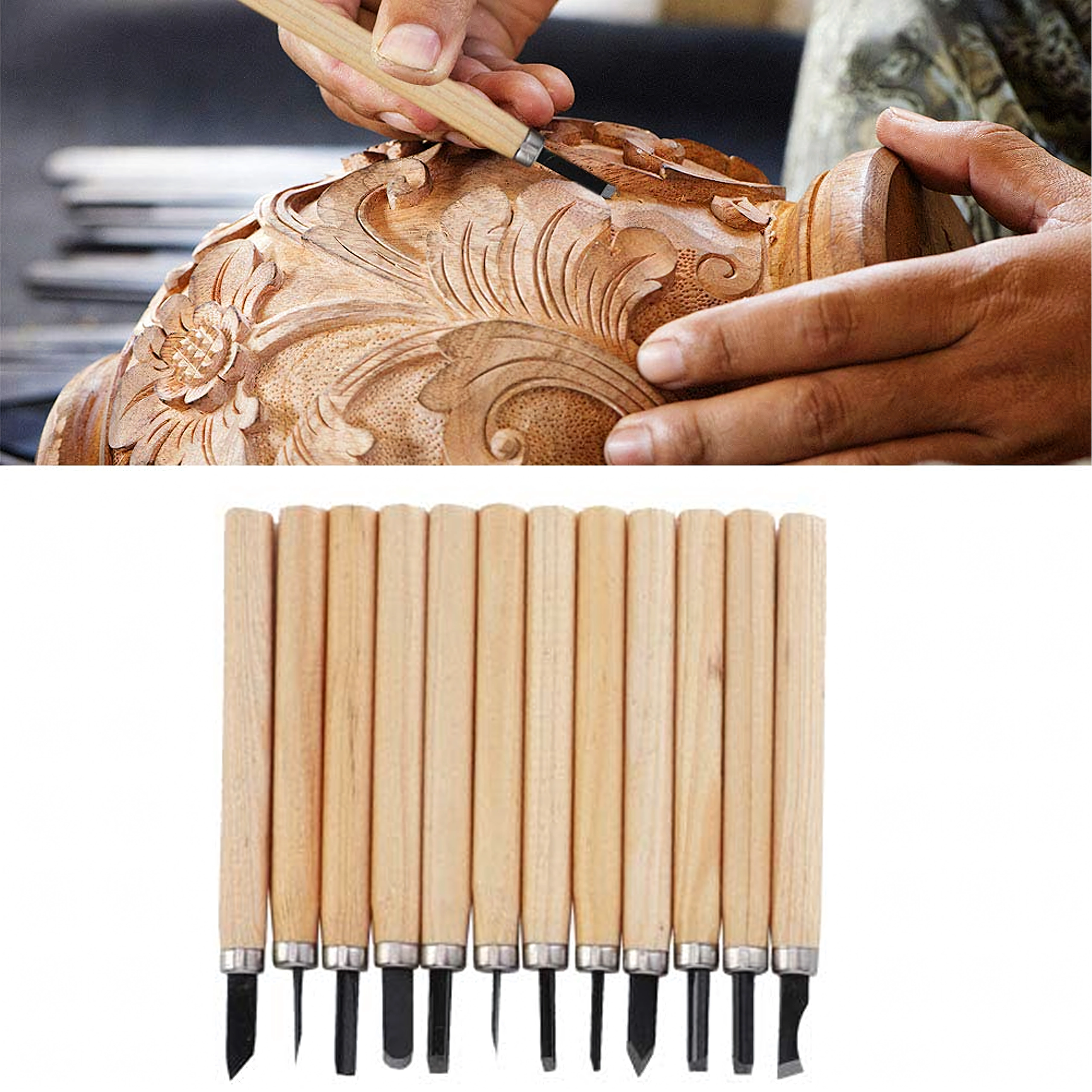 De set bevat platte, V- en U-gutsen voor details, uithollingen en vlak materiaalafname – alles wat u nodig heeft voor houtsnijprojecten.