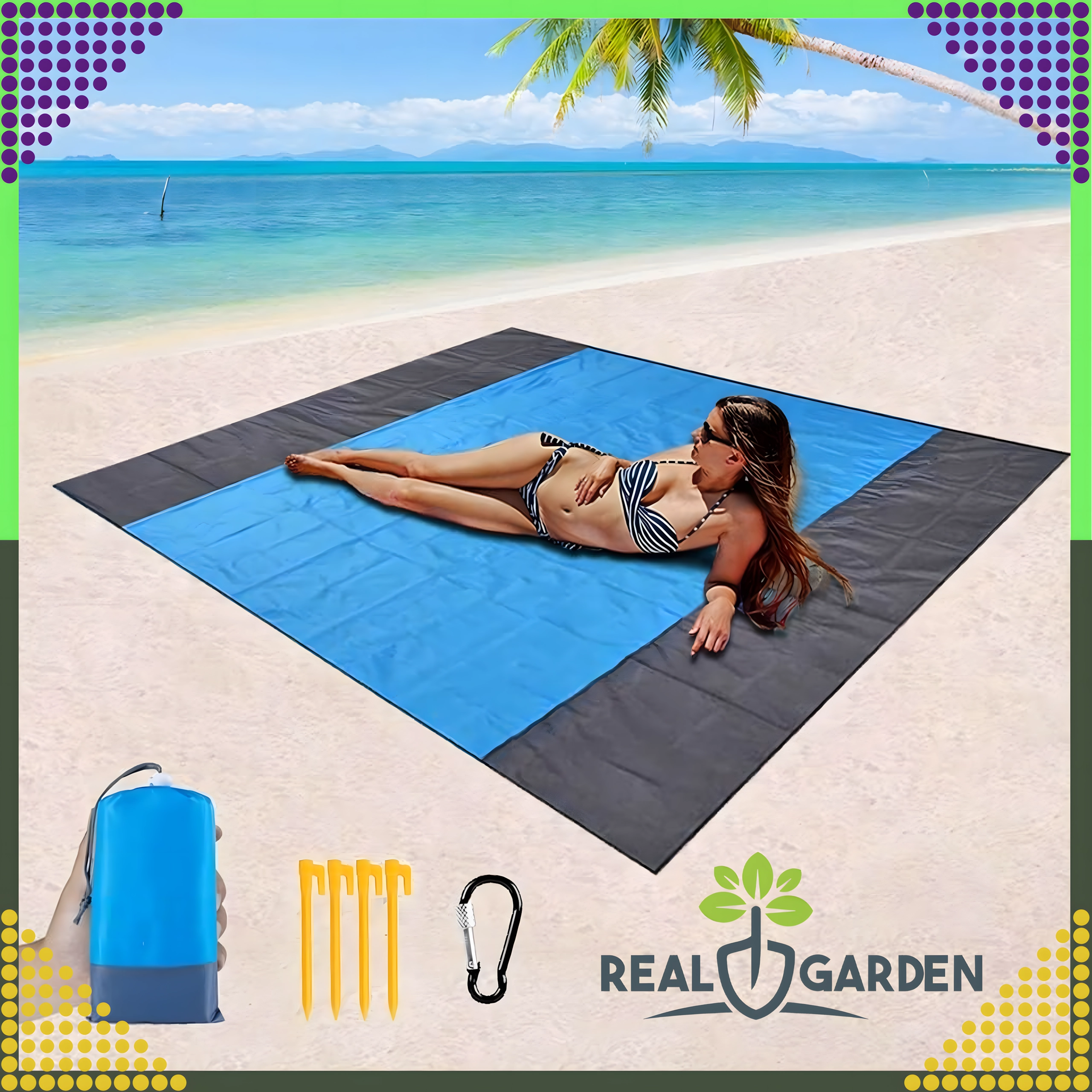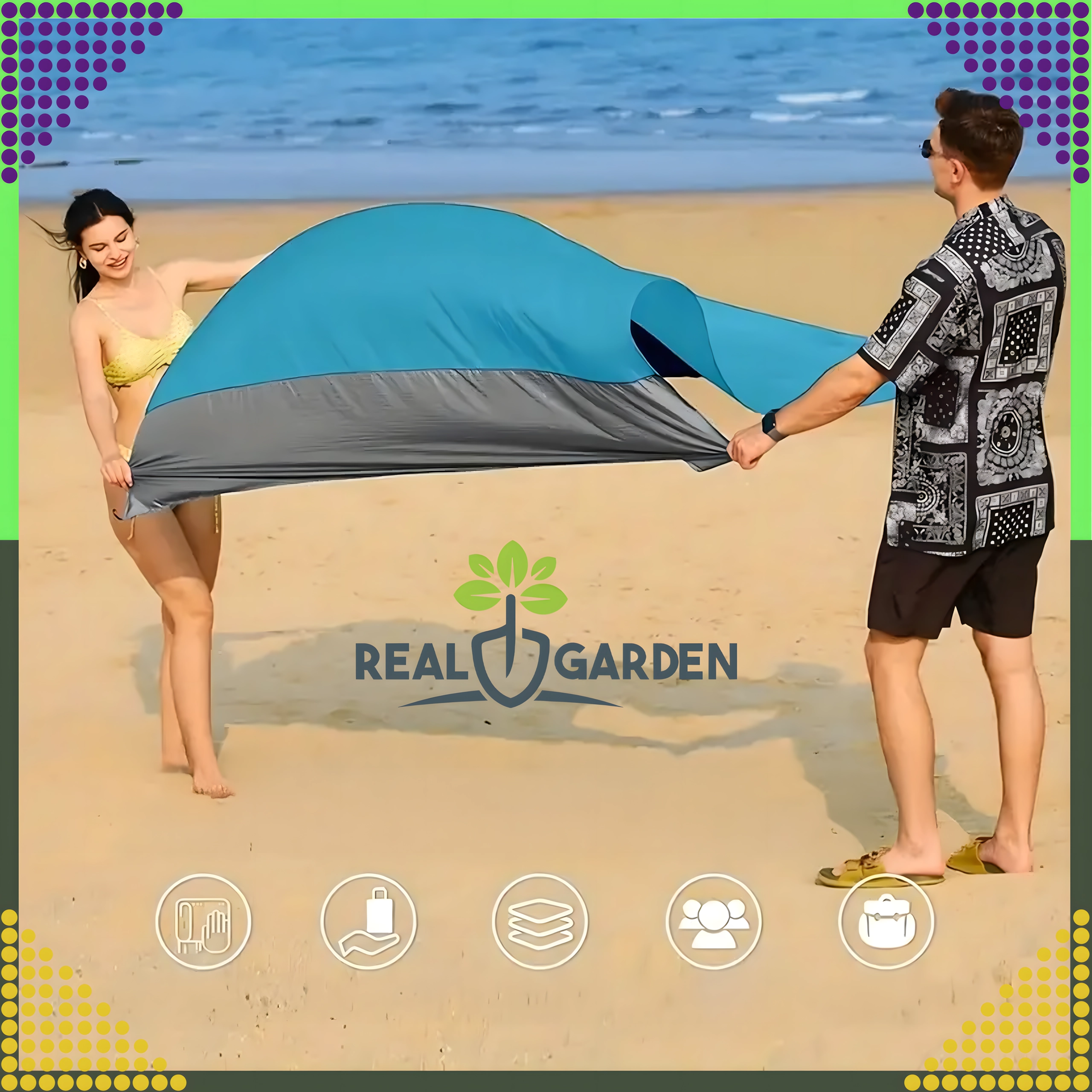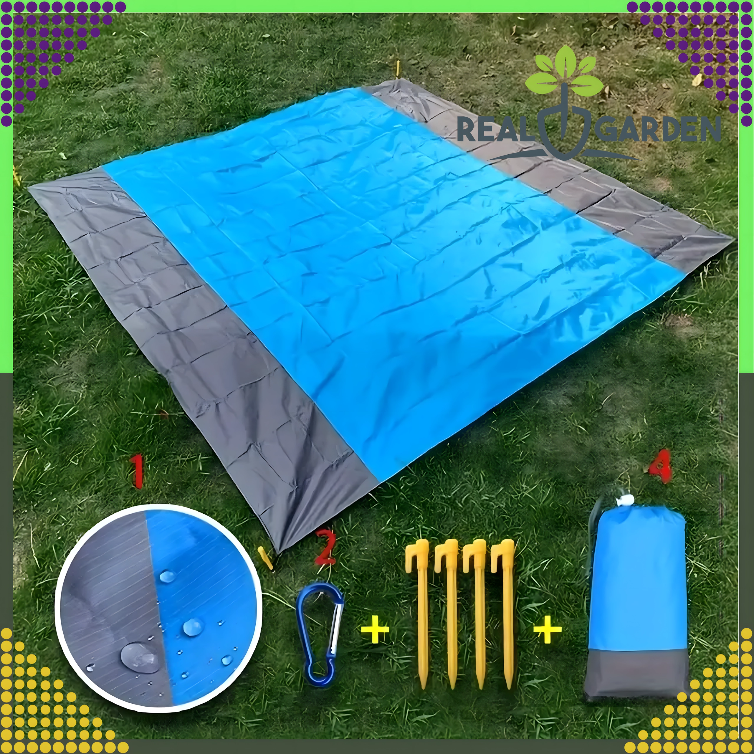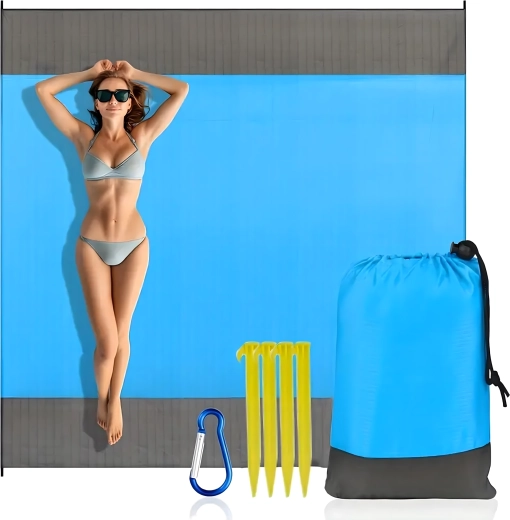 Praktische en comfortabele strand-/picknickdeken van 210 × 200 cm, ideaal voor strand, picknick en kamperen. Hij is waterdicht, licht, makkelijk opvouwbaar en blijft dankzij haringen/bevestiging stevig op zijn plek. Inclusief een praktische hoes. De deken beschermt tegen vocht, is eenvoudig te reinigen en biedt comfortabel plaats aan het hele gezin.