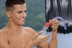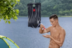 De Bestway zonnedouche is ideaal voor kamperen, strand, weekendhuisje of tochten zonder faciliteiten. Zwart PVC absorbeert zonnestralen en verwarmt het water tot een comfortabele temperatuur, zodat u kunt douchen of vaat afspoelen, zelfs op afgelegen plekken. De geïntegreerde thermometer laat u de gereedheid van de temperatuur eenvoudig controleren.