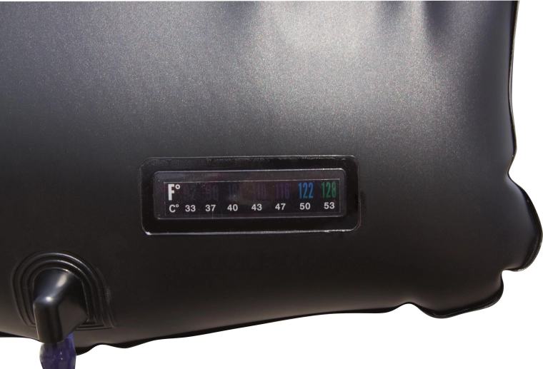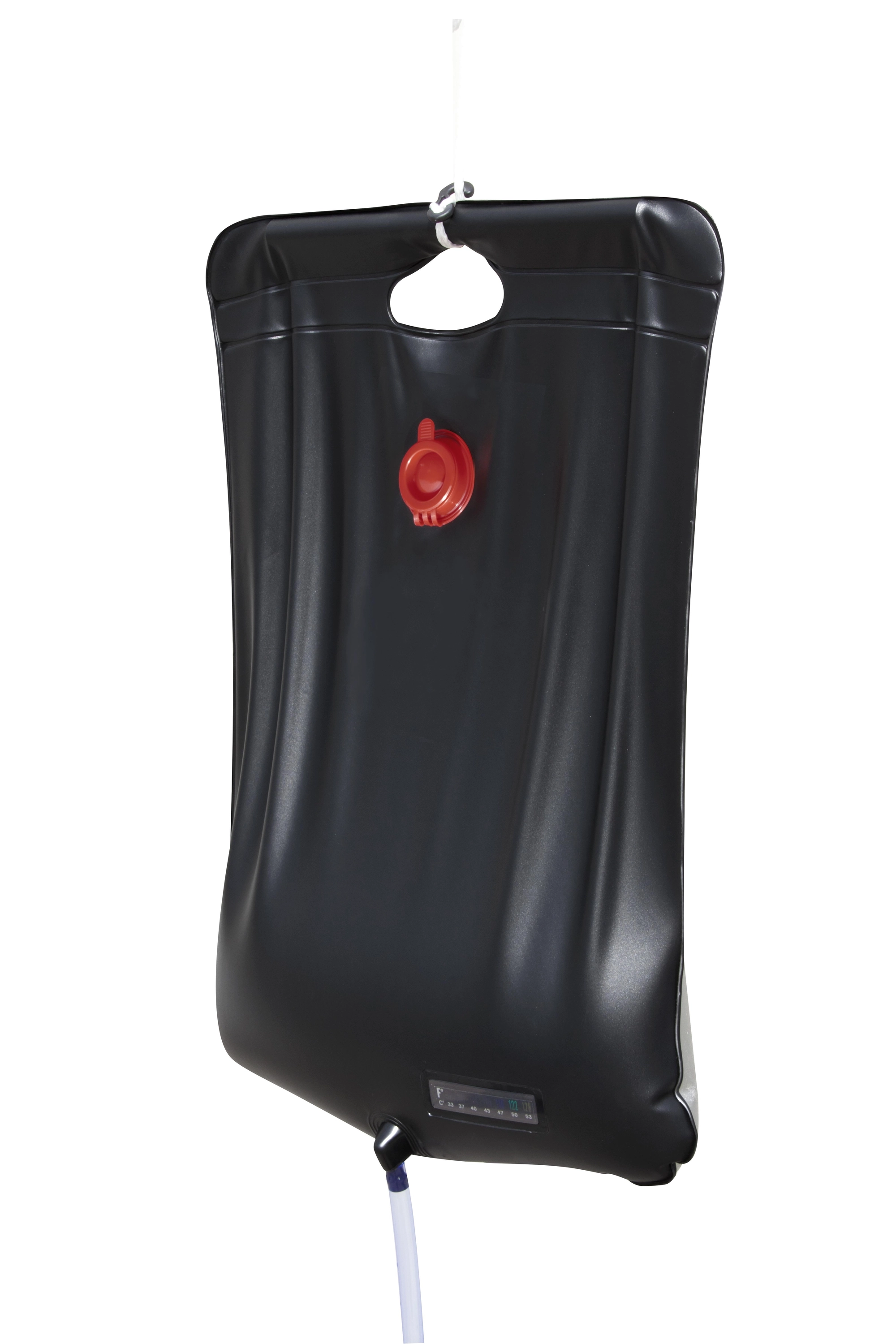 Het zwarte oppervlak absorbeert effectief zonnestraling en verwarmt tot 20 l water tot ongeveer 40 °C – ideaal voor een comfortabele douche op de camping of bij het water.