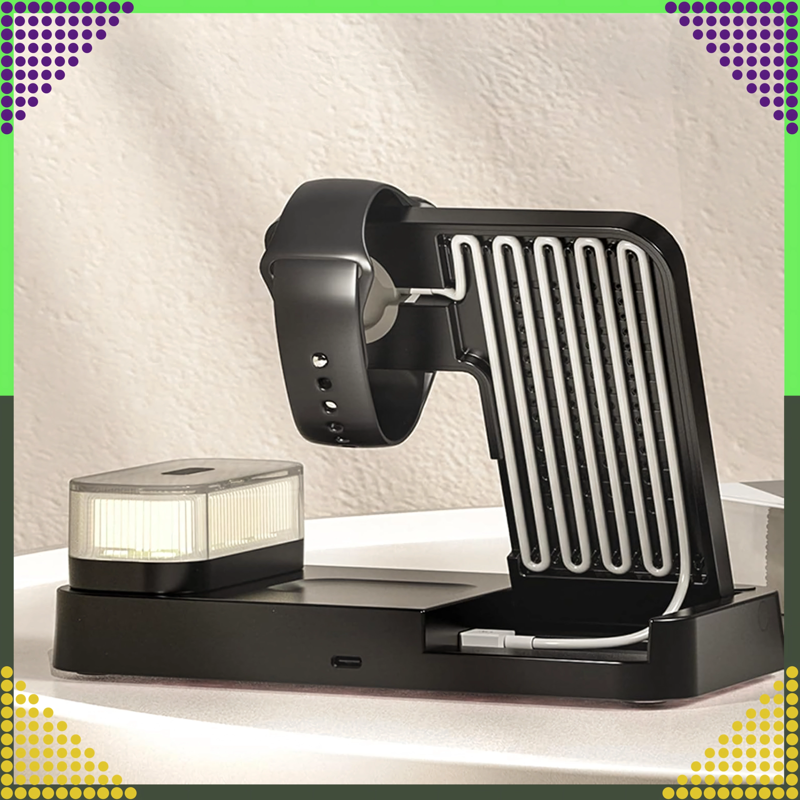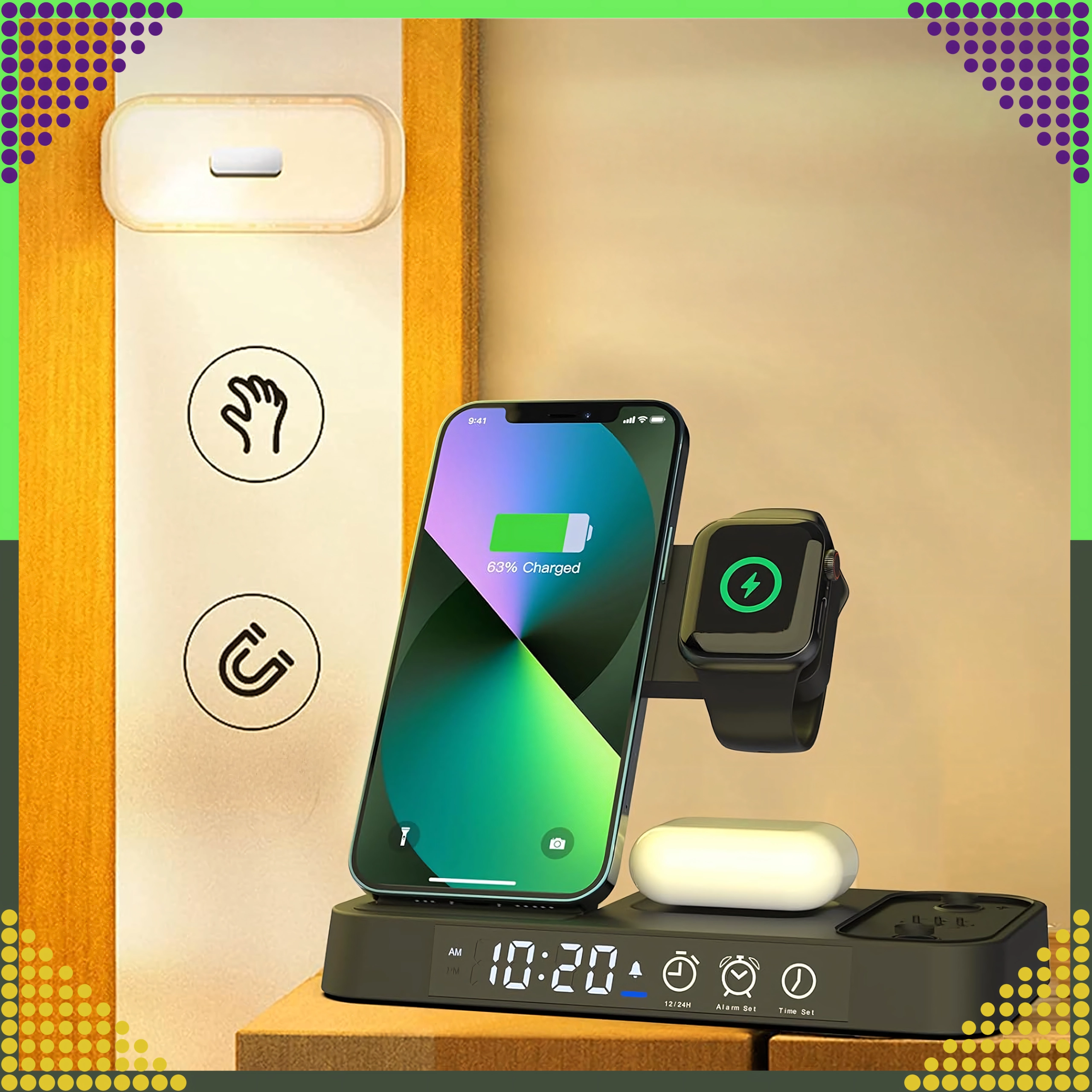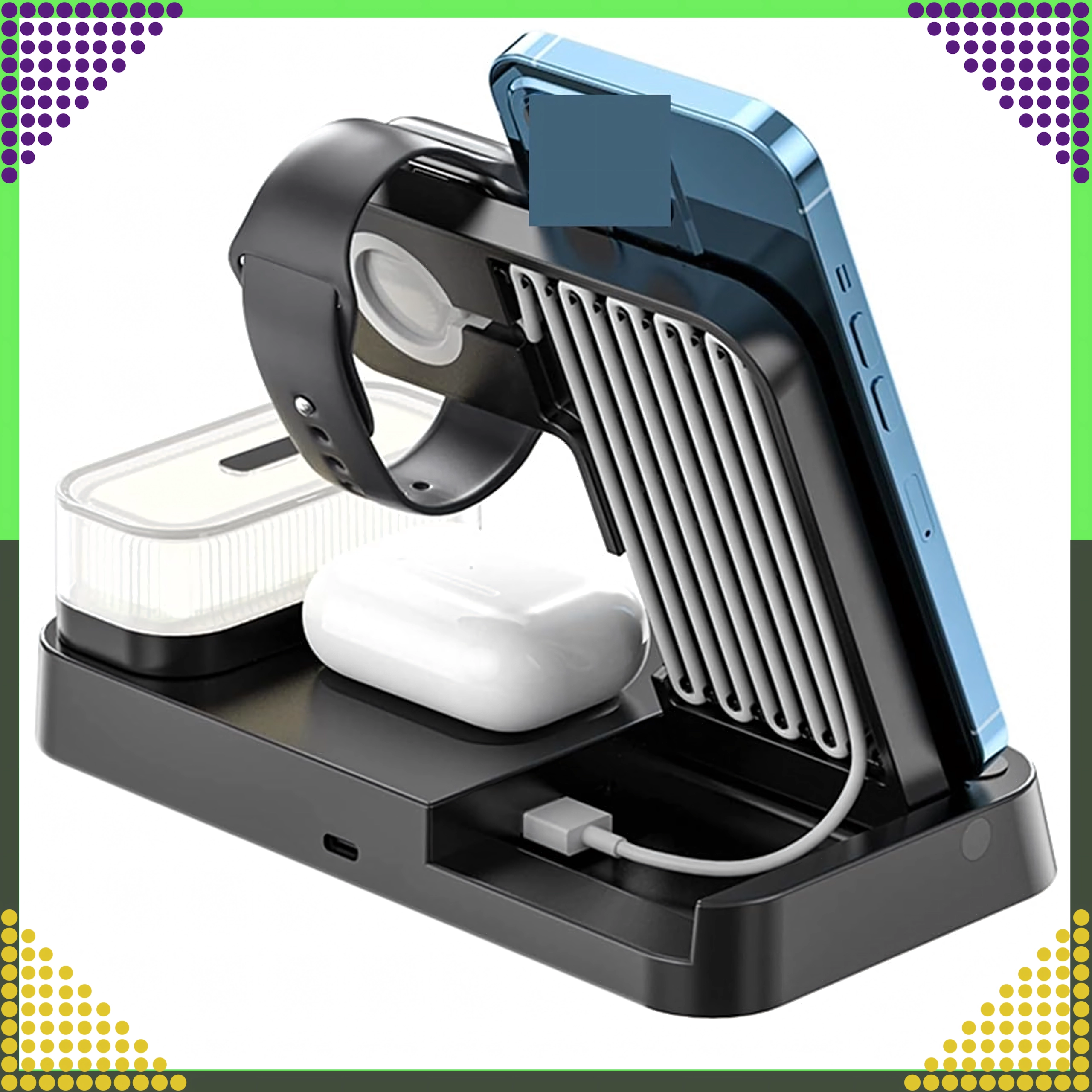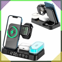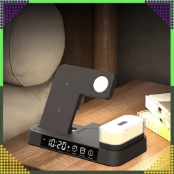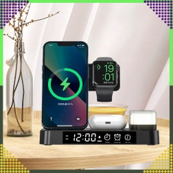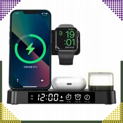 Deze moderne draadloze 4-in-1 oplader maakt het mogelijk om telefoon, smartwatch en draadloze oordopjes comfortabel tegelijk op te laden. Ondersteunt de Qi-standaard tot 15 W voor snel en veilig laden en dankzij de magnetische houder blijft een compatibele smartphone stevig rechtop staan.