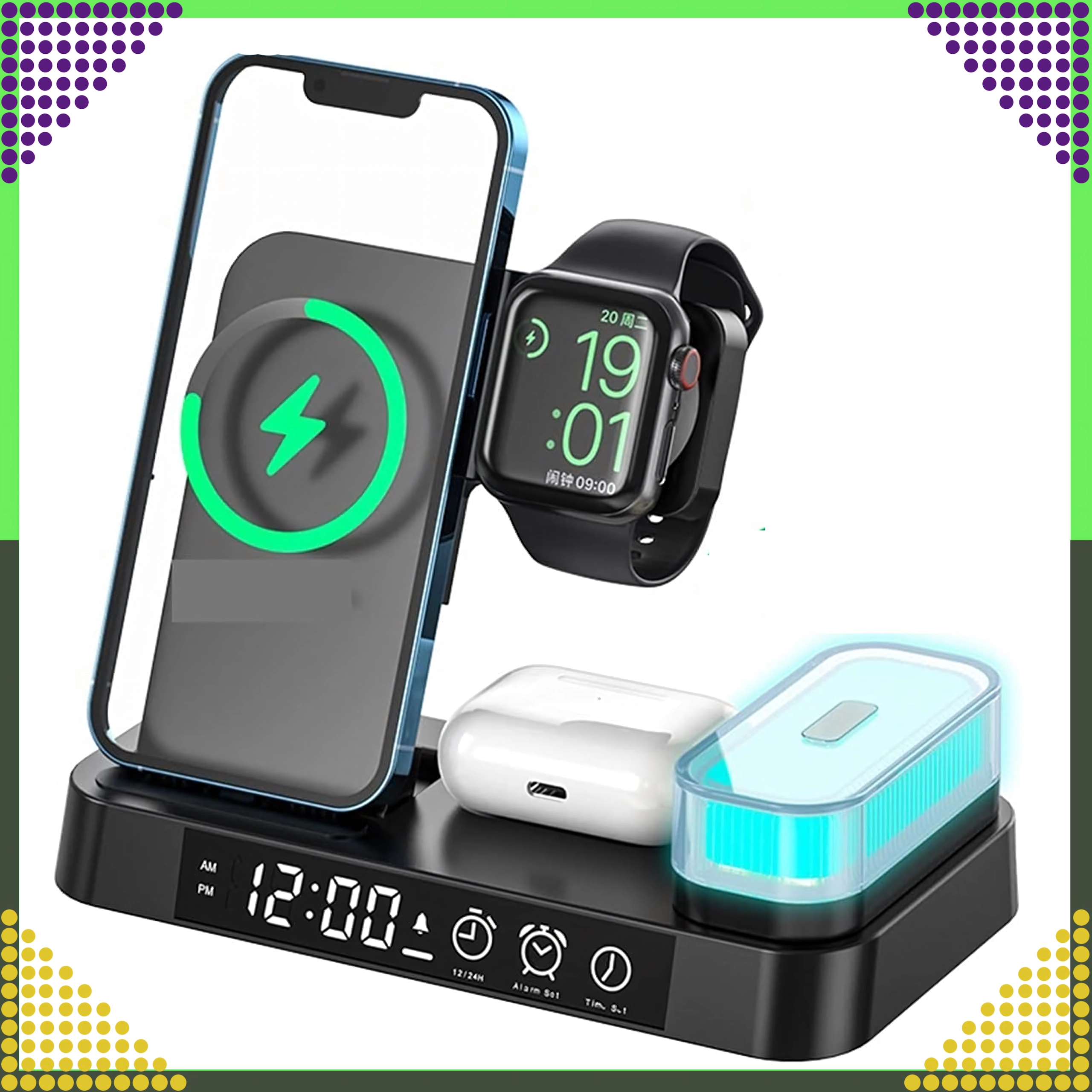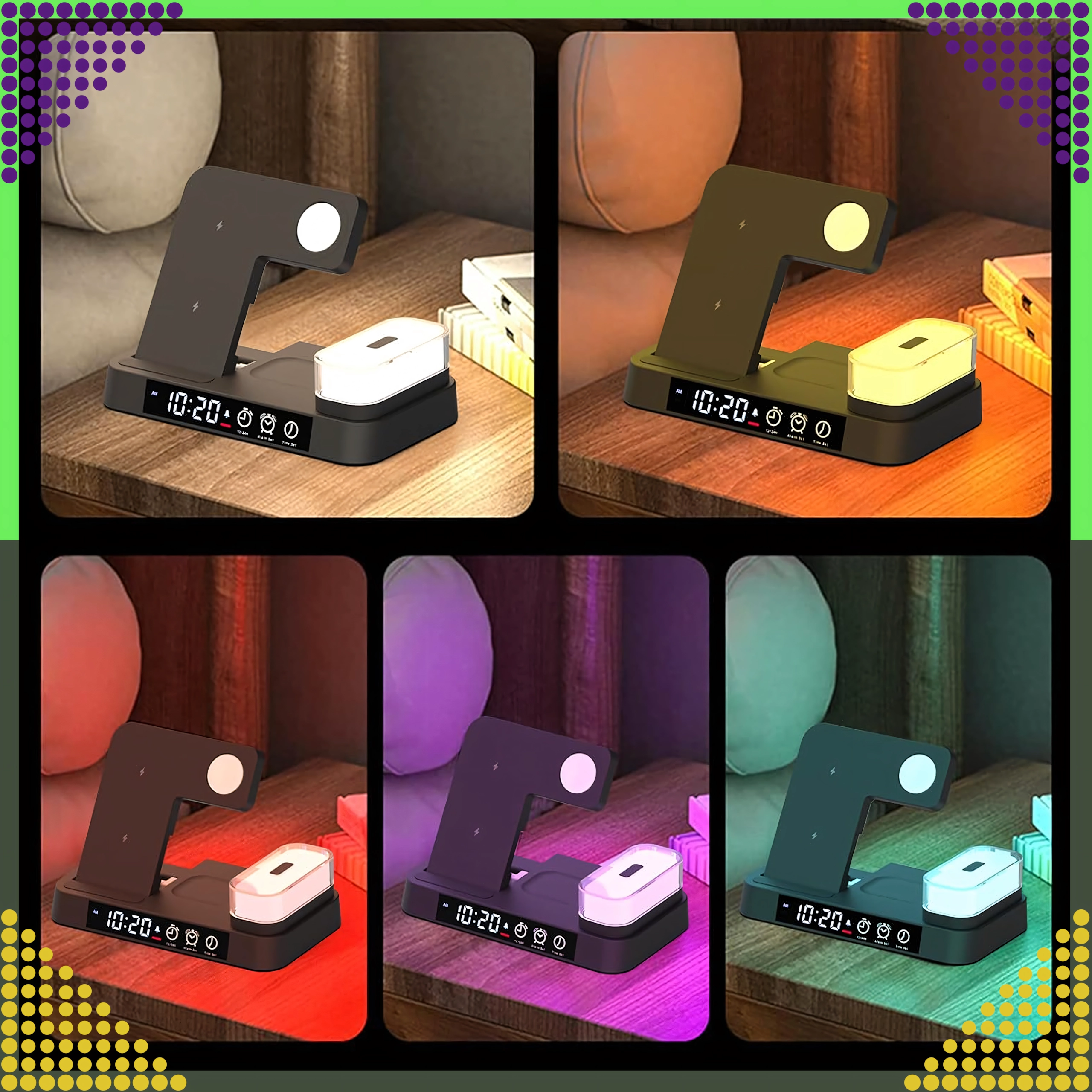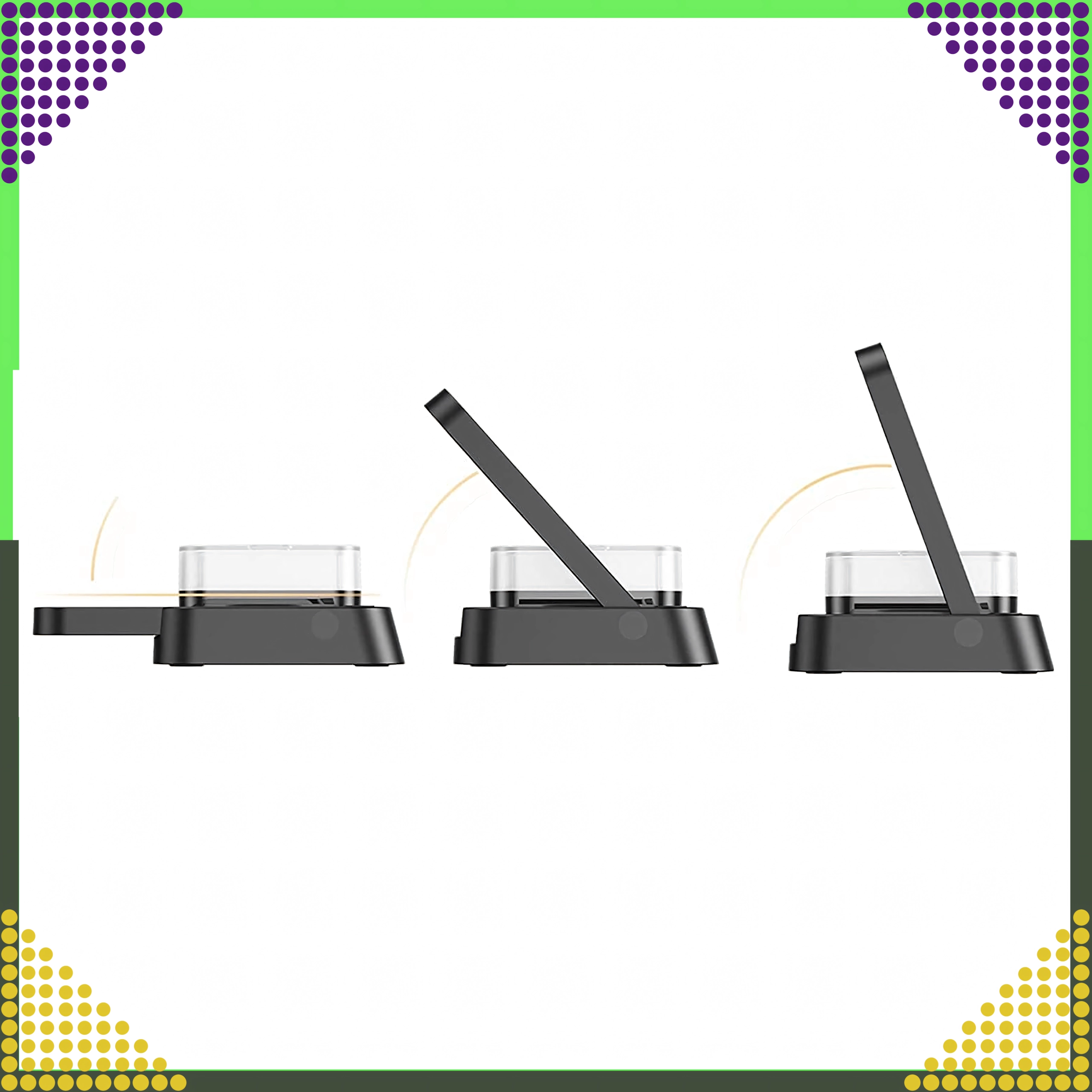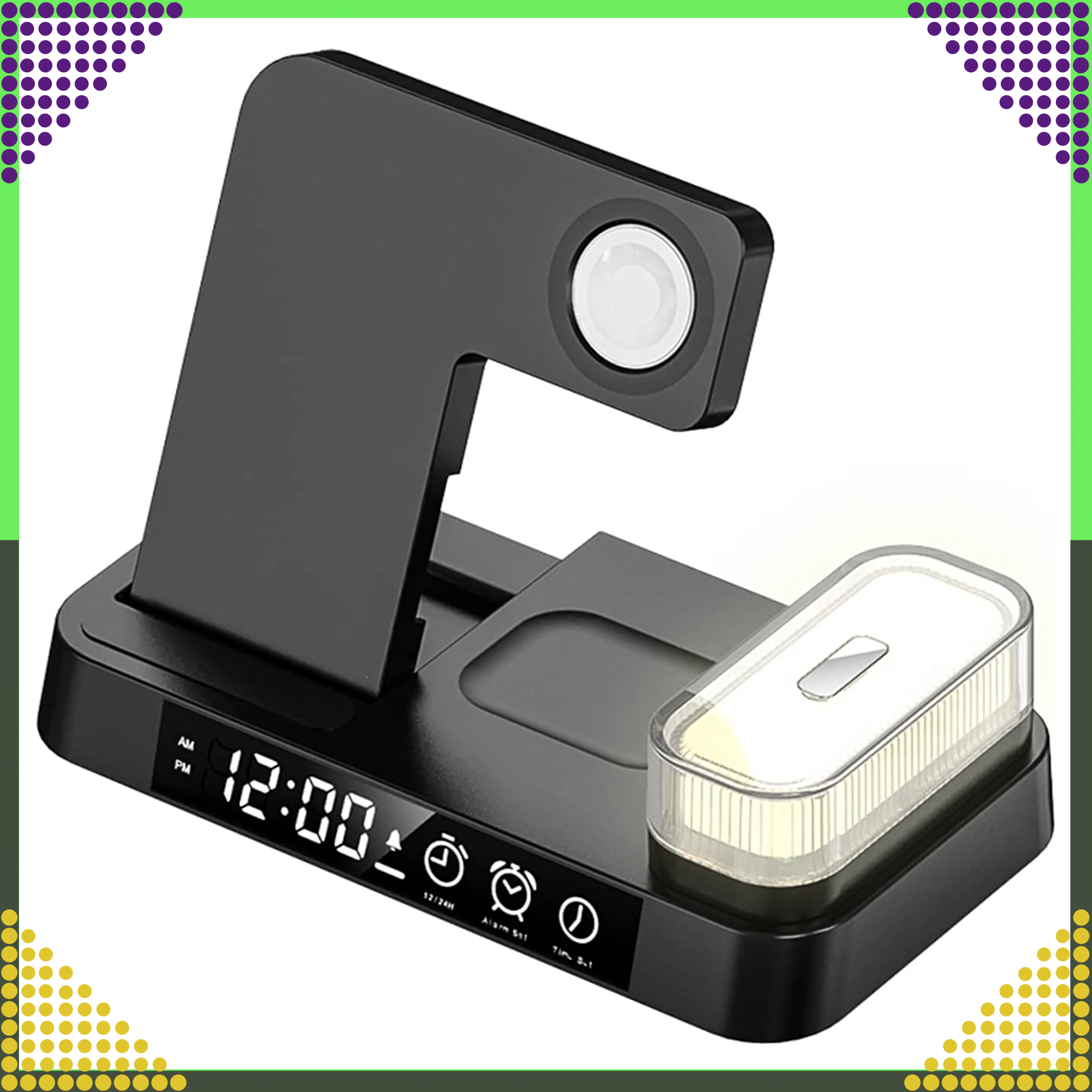 Deze moderne draadloze 4-in-1 oplader maakt het mogelijk om telefoon, smartwatch en draadloze oordopjes comfortabel tegelijk op te laden. Ondersteunt de Qi-standaard tot 15 W voor snel en veilig laden en dankzij de magnetische houder blijft een compatibele smartphone stevig rechtop staan.