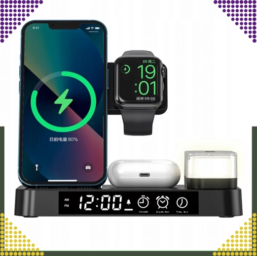 Universeel draadloos 4-in-1 station combineert snelladen 15 W, een telefoonstandaard, opladen voor Apple Watch en AirPods en bovendien LED-klok met nachtlampje. Het elegante, opvouwbare design bespaart ruimte en is compatibel met alle apparaten die Qi ondersteunen.