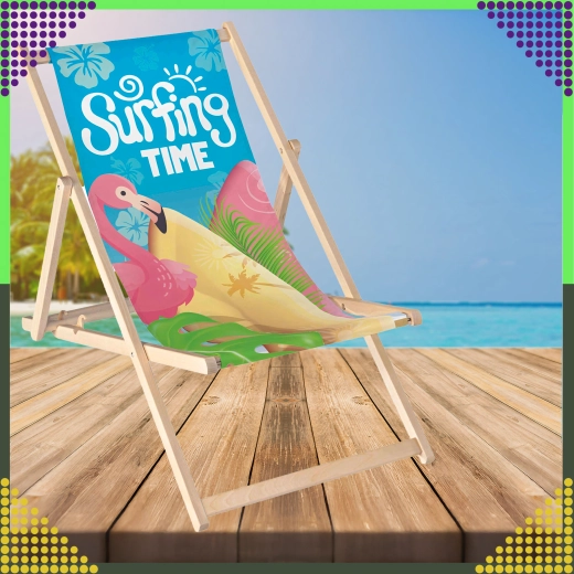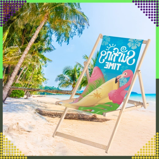 De set van twee inklapbare ligstoelen combineert natuurlijk hout met een duurzame canvasachtige stof en een kleurrijke flamingo-print “Surfing Time”. Dankzij het meerstandenmechanisme stel je eenvoudig de comfortabele zit- of lighoek in. De lichte constructie maakt gemakkelijk dragen en opbergen mogelijk, zowel thuis als onderweg.