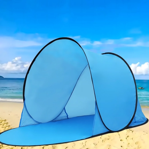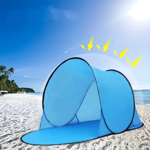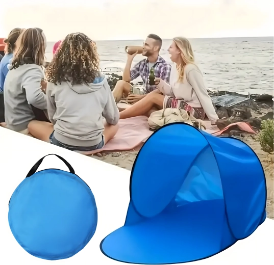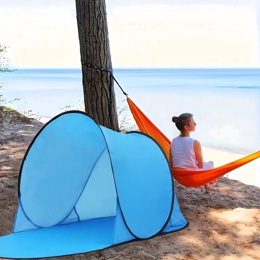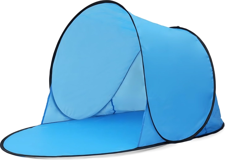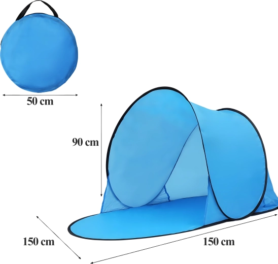 Praktische pop-up strandtent die zich binnen enkele seconden zelf opzet. Biedt bescherming tegen zon (UV), wind en lichte regen. Licht, compact en ideaal voor strand, tuin en picknick. Inclusief draagtas en haringen voor verankering.