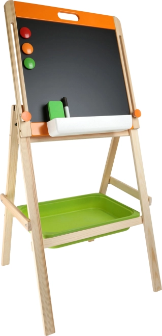 De stabiele houten constructie met afstandsvoetjes zorgt voor veilig schrijven zonder wiebelen en de praktische groene opbergbox houdt krijt, stift en magneten altijd binnen handbereik. Het bord stimuleert actief spel, de ontwikkeling van motoriek, fantasie en basis van alfabet en rekenen.