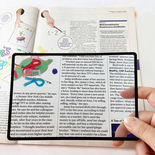 De rechthoekige lens bedekt een groot deel van de pagina, zodat u vergrote tekst ziet zonder de loupe steeds te hoeven verplaatsen.