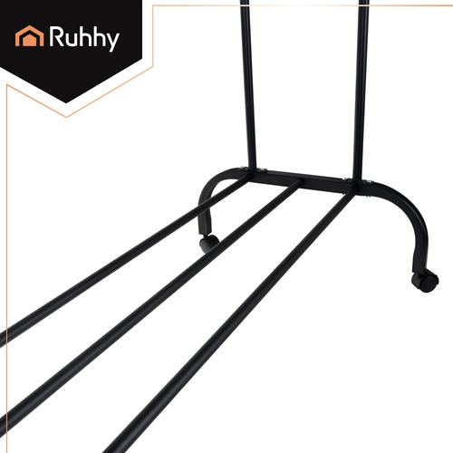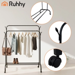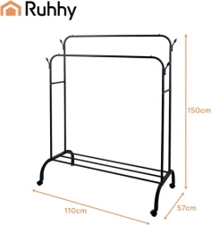Zoek je een praktische en ruimtebesparende oplossing voor kleding, schoenen en accessoires? De RUHHY-standaard met twee stangen biedt voldoende ruimte voor overhemden, jassen en jurken zonder kreuken. Zwenkwielen met 360° rotatie en rem zorgen voor eenvoudig verplaatsen en stabiele positionering, terwijl de onderste plank meerdere paren schoenen of opbergboxen kan dragen.
