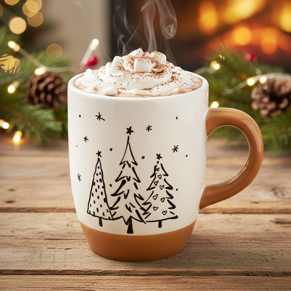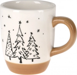 Breng een feestelijke sfeer in huis met deze elegante keramische mok, versierd met minimalistische boompjes. De combinatie van witte glazuur met een beige oor en voet oogt smaakvol en tijdloos, waardoor de mok bij elke tafelsetting past.