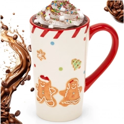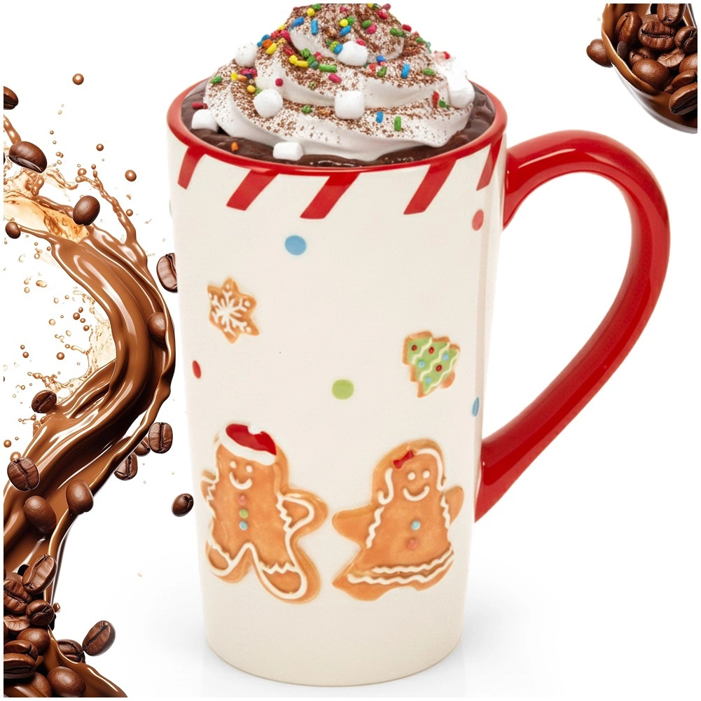 Breng een feestelijke sfeer in huis met deze hoge keramische mok, versierd met reliëfdetails van peperkoekmannetjes, sneeuwvlokken en een kerstboom. Het contrasterende rode oor en de rand geven de mok een opvallende look, terwijl de hoge vorm een royale inhoud van 570 ml biedt voor je favoriete warme dranken.