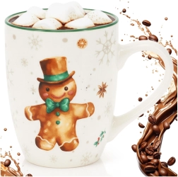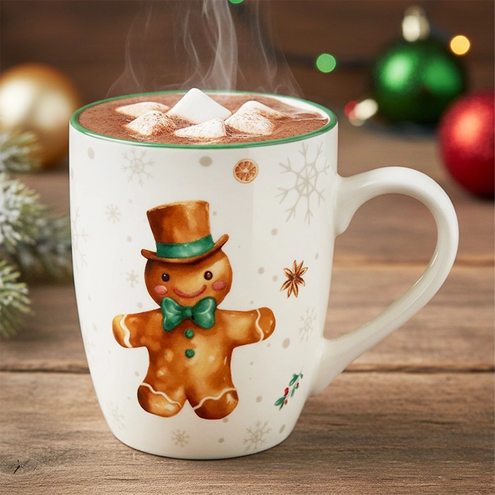 Geniet van winterse gezelligheid met deze porseleinen mok met een peperkoekmannetje. Hij heeft een inhoud van 320 ml, een comfortabel oor voor eenvoudig vasthouden en een elegante groene rand. Vaatwasser- en magnetronbestendig en perfect voor koffie, thee en warme chocolademelk.