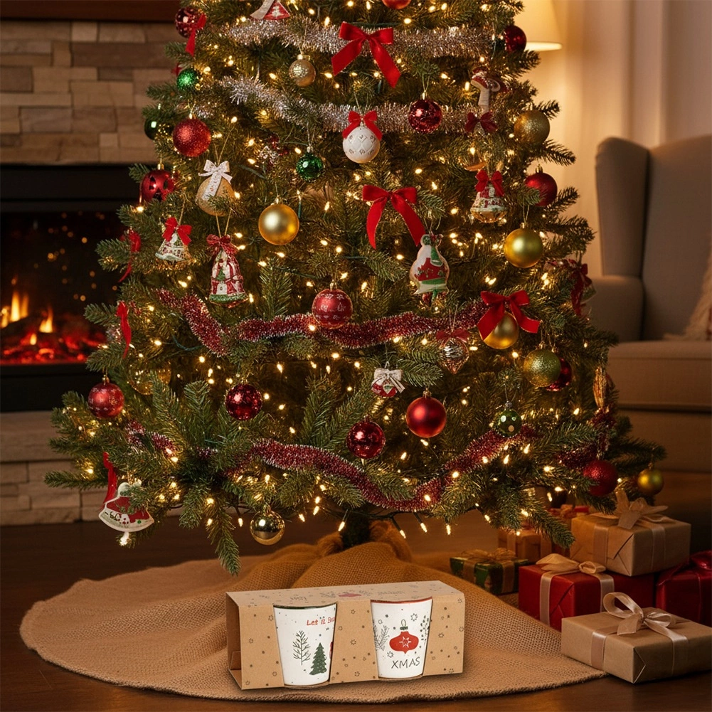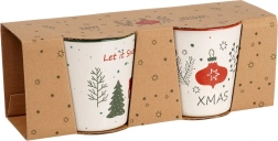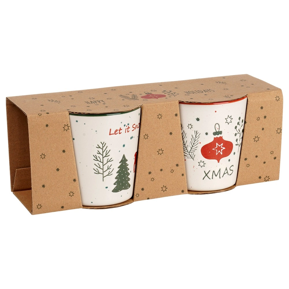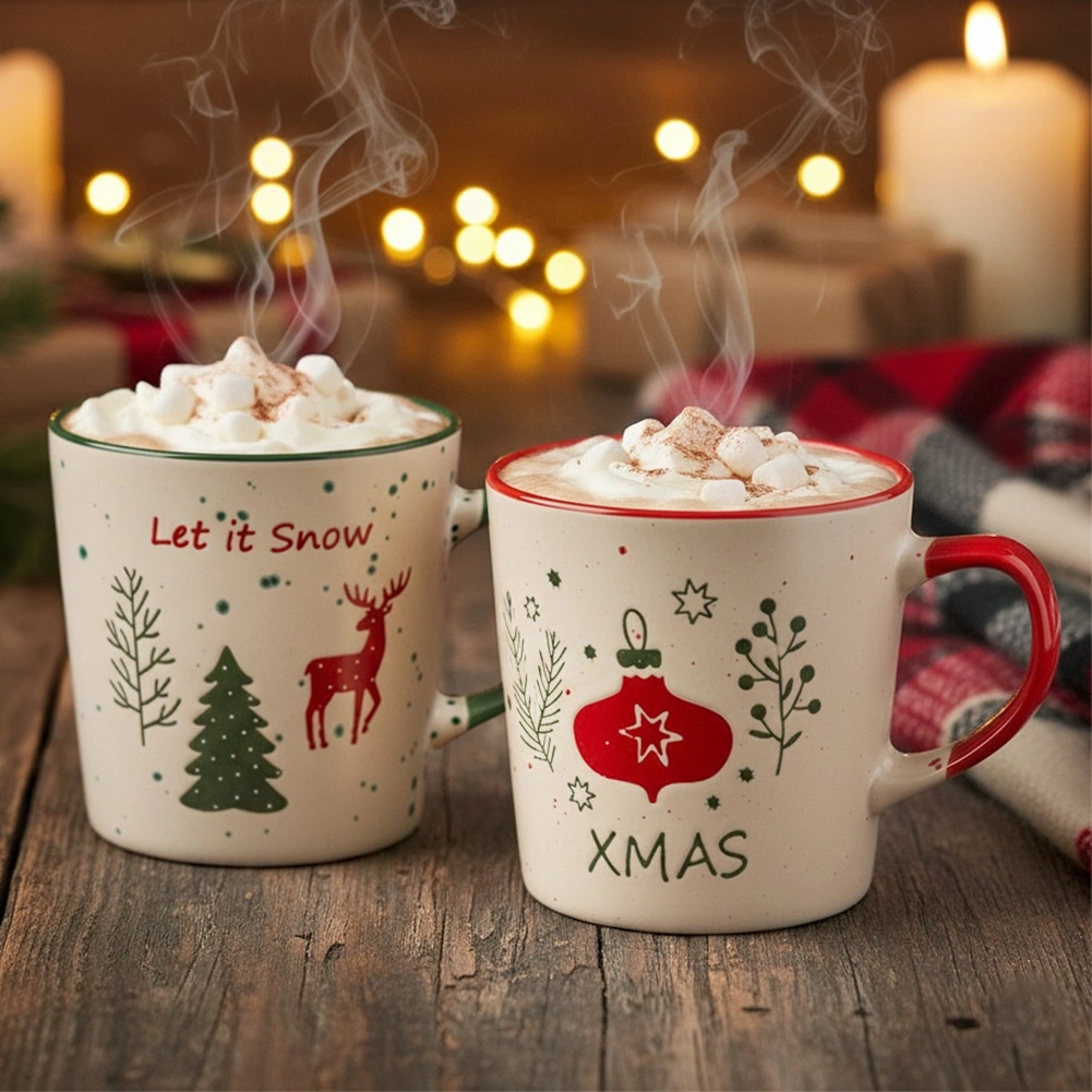 Beige mokken met een gekleurde rand en oor zijn versierd met de motieven LET IT SNOW en XMAS, een hert, boompjes en ornamenten – ideaal voor winterse thee en warme chocolademelk.