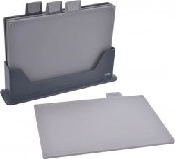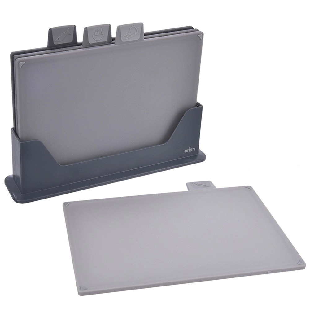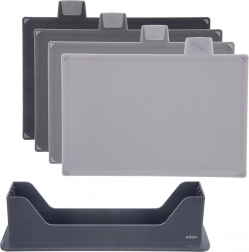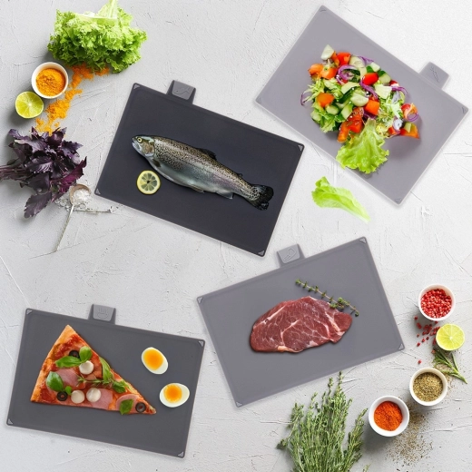 Deze set van 4 planken in grijstinten is ontworpen voor dagelijks koken met focus op hygiëne en organisatie. Grafische labels op de bovenste tabs geven duidelijk aan voor groenten, rauw vlees, bereide gerechten en vis, zodat je eenvoudig schoon en geordend kunt werken.