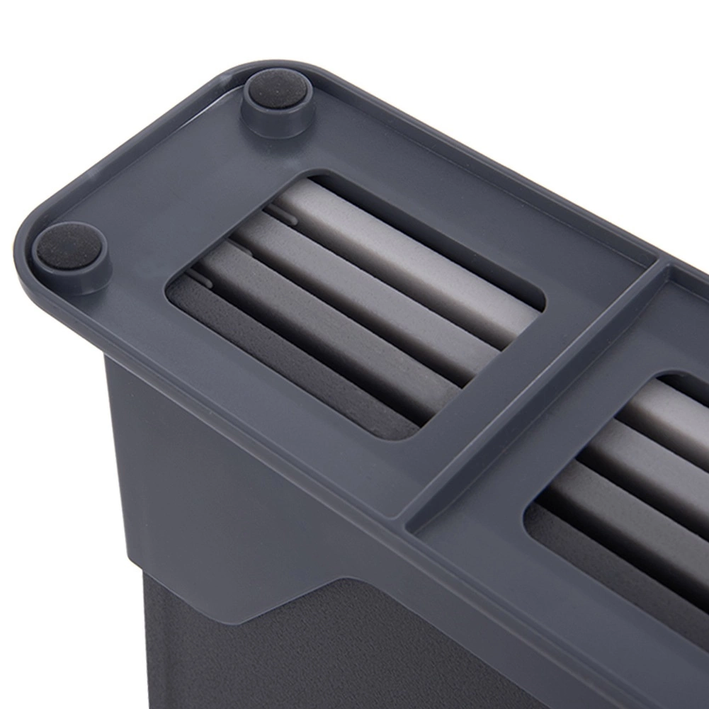 De compacte houder met gevormde sleuven houdt de planken rechtop, heeft foam pads tegen verschuiven en beschermt het werkblad tegen krassen.