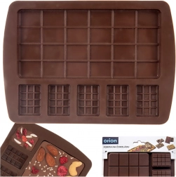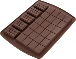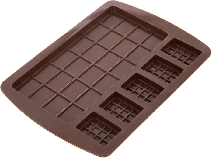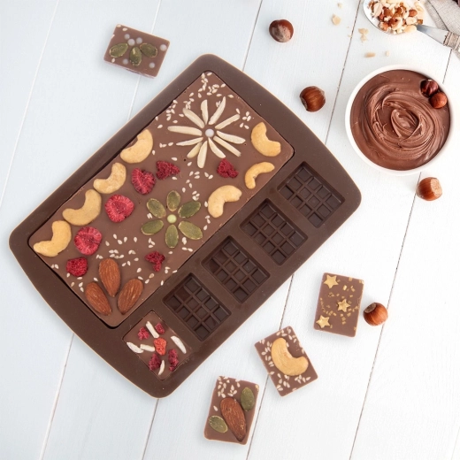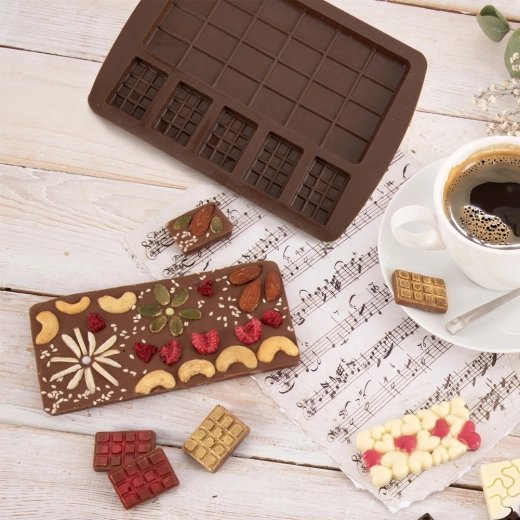 Met deze veelzijdige mal van hoogwaardige siliconen maak je indrukwekkende repen en mini pralines met noten, gedroogd fruit of koekjes. Het flexibele materiaal is stevig, duurzaam en plakt niet, zodat je de afgewerkte stukjes zonder beschadigen kunt lossen. De mal heeft totale afmetingen van 18,5 × 13,5 × 1,5 cm.
