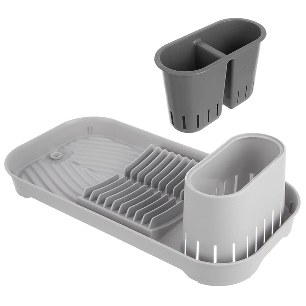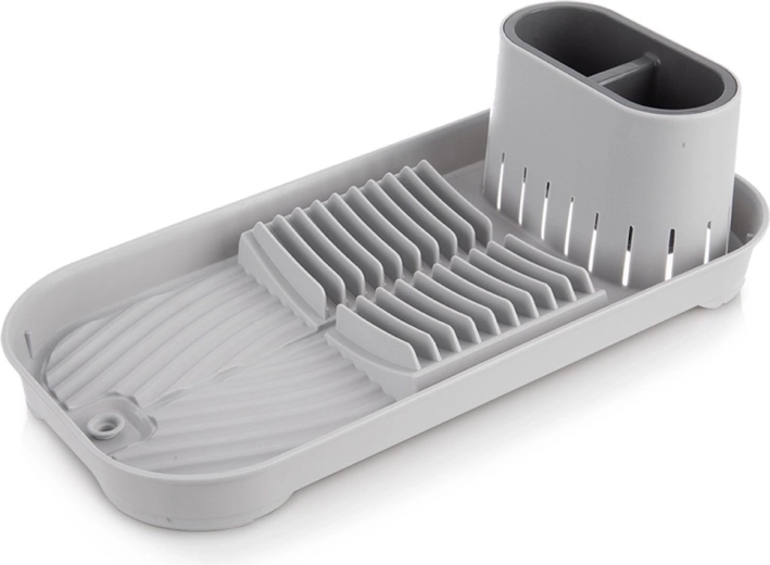 De onderzijde met gegroefd oppervlak en ingebouwde afvoer met stop voert water efficiënt af, waardoor een extra lekbak niet nodig is. Antislip elementen zorgen voor stabiliteit en voorkomen verschuiven tijdens gebruik. Het afdruiprek is gemaakt van duurzaam kunststof in het grijs, is eenvoudig te onderhouden en klaar voor dagelijks gebruik.