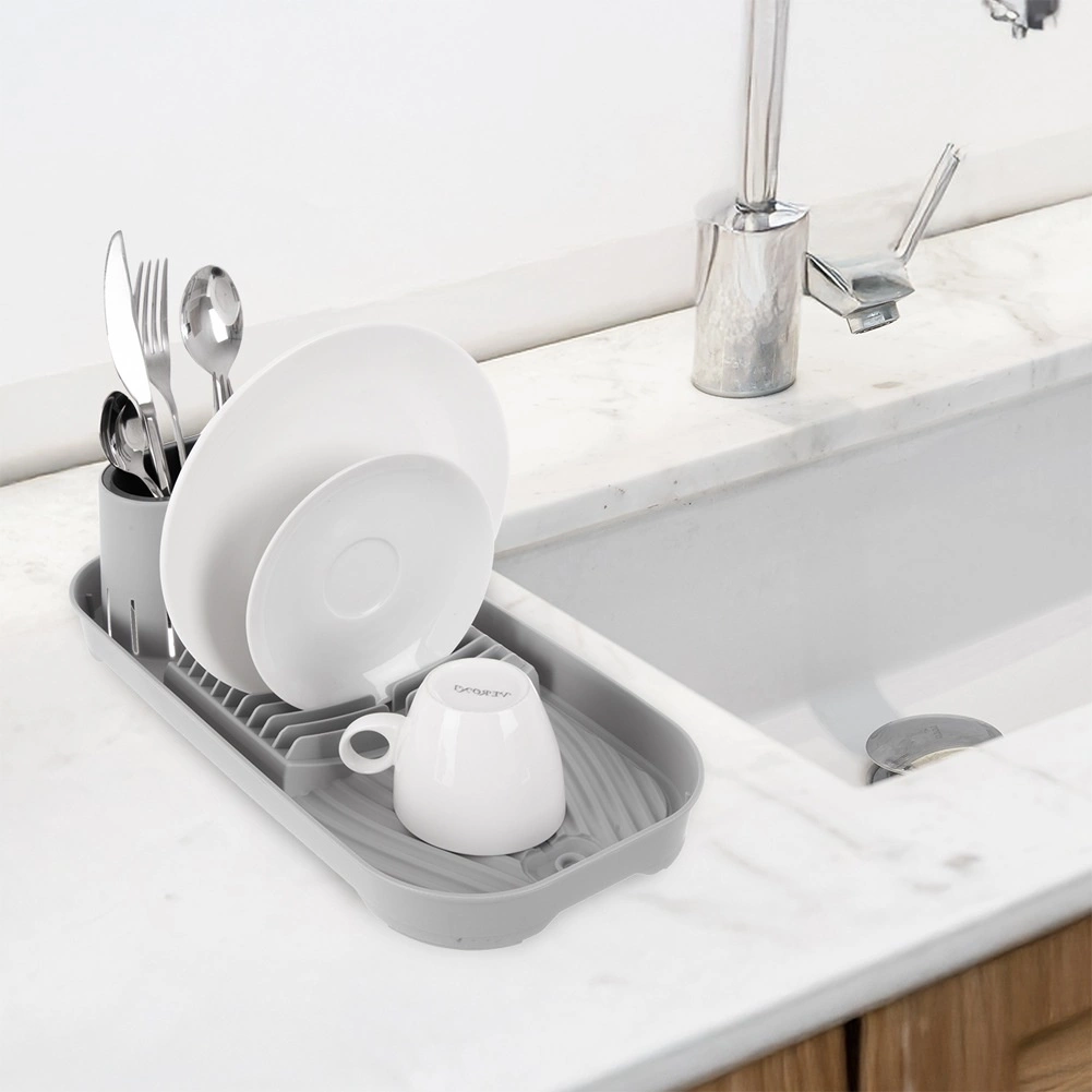 Bordenhouders, plaats voor mokken en een uitneembare bestekmand met twee vakken. Ideaal voor kleine keukens, appartementen en campers.