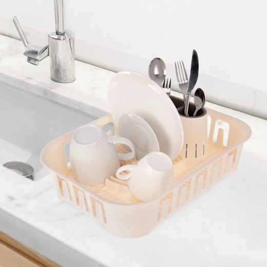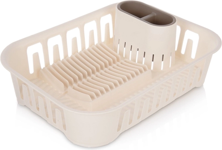 Houd de gootsteen en het aanrecht droog en opgeruimd. Dit compacte afdruiprek in crèmekleur biedt een doordachte indeling voor borden, mokken en bestek. Dankzij de geïntegreerde afvoer met stop loopt het water direct in de gootsteen weg, waardoor je geen extra lekbak nodig hebt en het werkblad beschermd blijft.