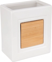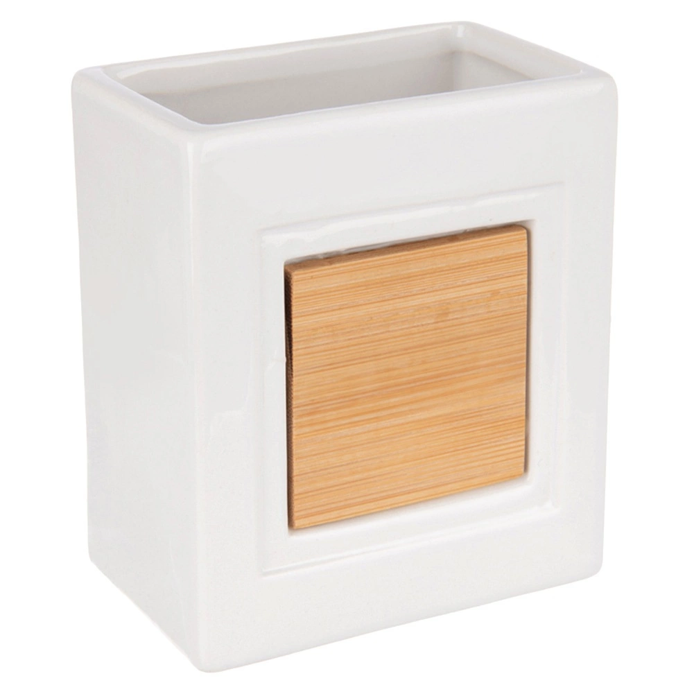 Glanzend wit oppervlak met bamboepaneel oogt elegant en houdt borstels en kleinigheden binnen handbereik.
