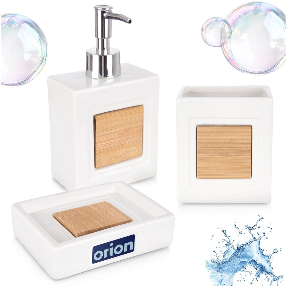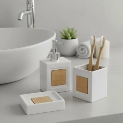 De set bevat een dispenser voor vloeibare zeep met nauwkeurige dosering, een beker voor tandenborstels of cosmetische accessoires en een zeepschaaltje voor hygiënisch wegleggen van een vaste zeep. Ideaal voor badkamer en toilet – helpt orde en een elegante uitstraling te behouden.