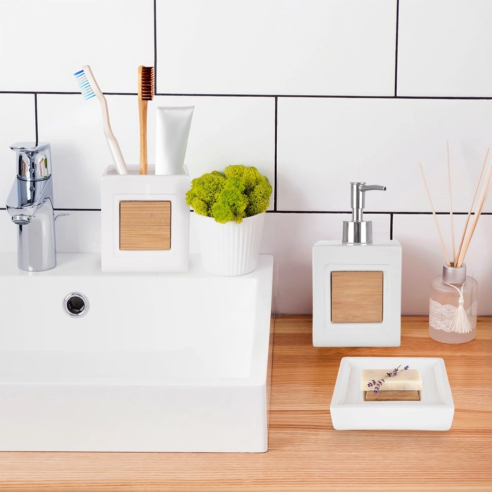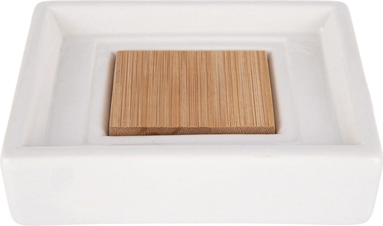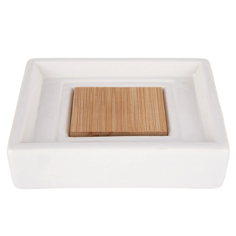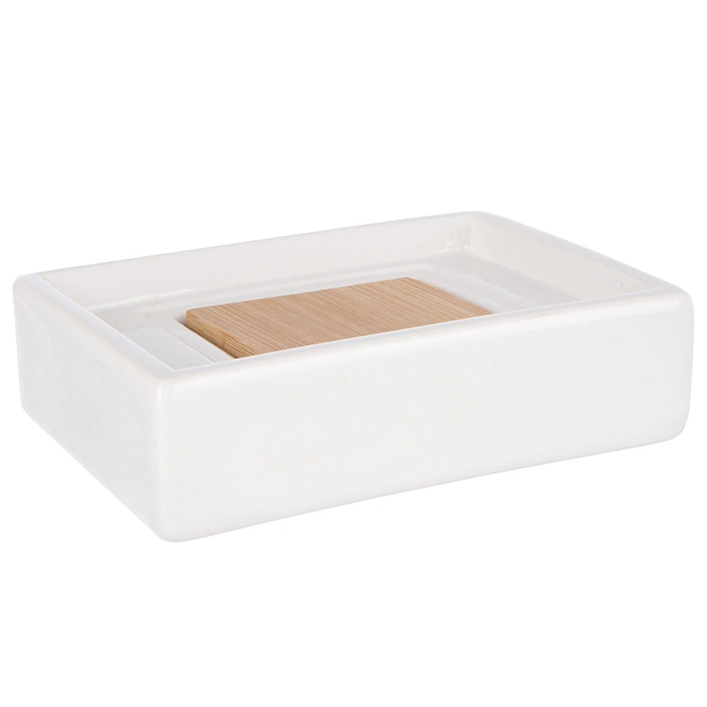 Dit praktische zeepbakje combineert glanzende keramiek (dolomiet) en natuurlijk bamboe voor efficiënte waterafvoer en een strakke look in je badkamer of keuken. Dankzij de verhoogde houten inzet ligt de zeep niet in water, droogt ze beter en gaat ze langer mee.