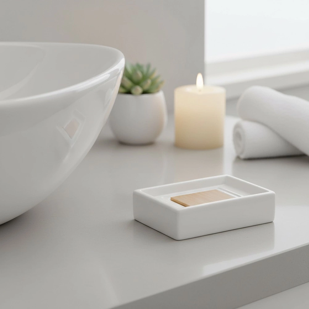 Het minimalistische witte design past uitstekend bij diverse interieurstijlen en het gladde oppervlak is gemakkelijk schoon te maken. De afmetingen 11 × 8 × 3 cm besparen ruimte op de wastafel en bieden tegelijk voldoende plek voor een standaard stuk vaste zeep.