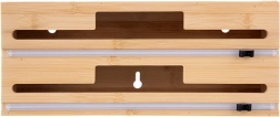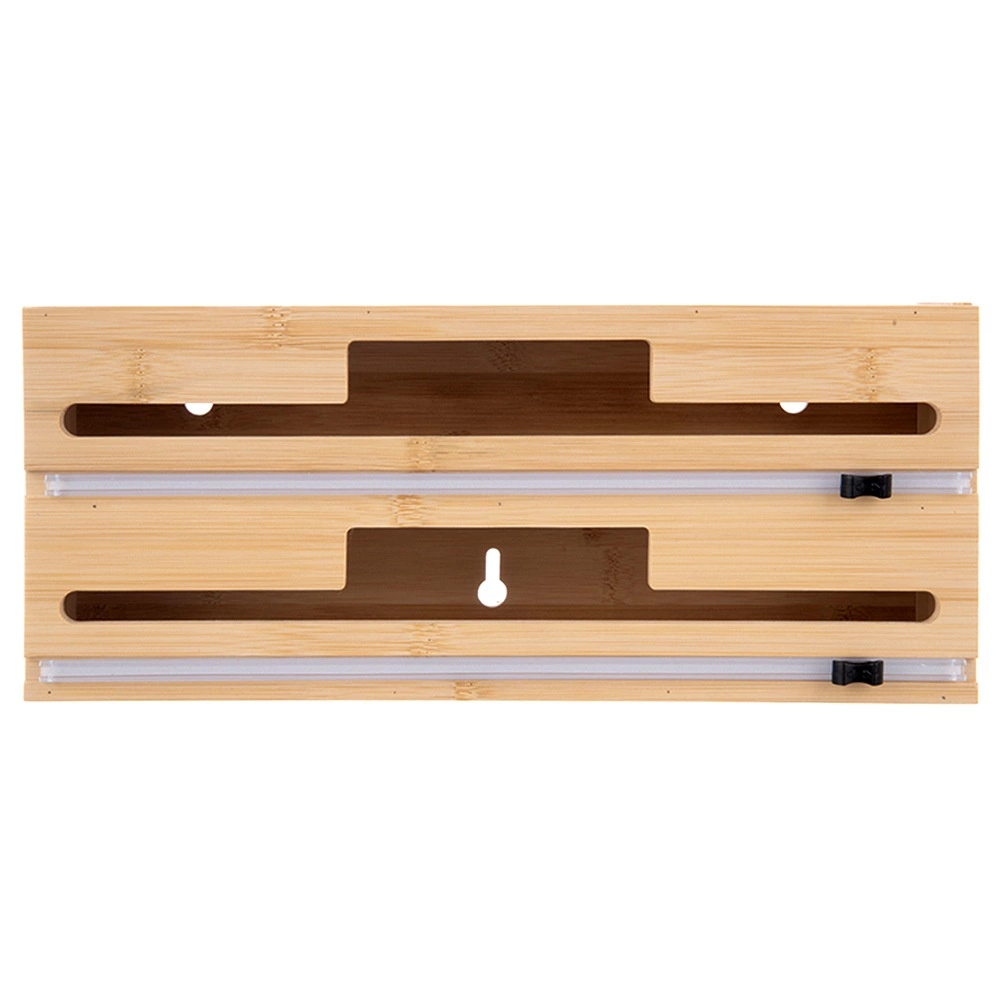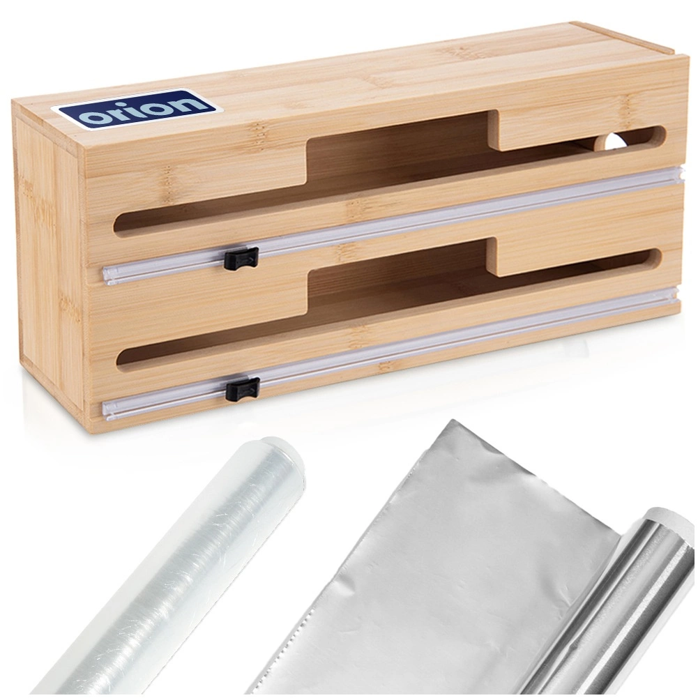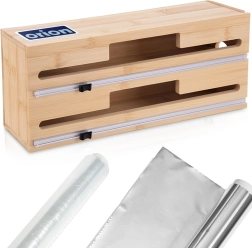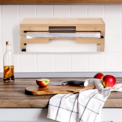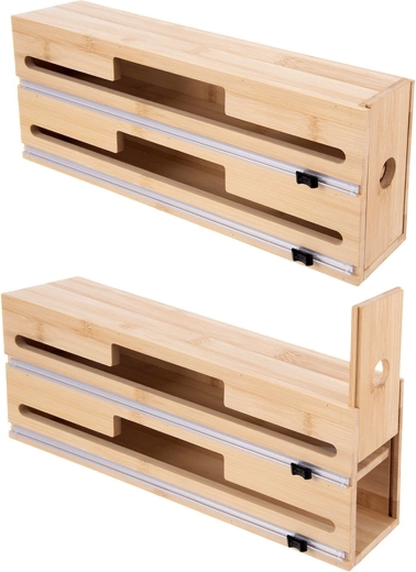 Praktische bamboe 2-in-1 dispenser voor huishoudfolie, aluminiumfolie en bakpapier houdt je keuken overzichtelijk en efficiënt. Biedt twee aparte banen met precieze schuifsnijders voor soepele, rechte sneden zonder kreukels. Stevig bamboehout met elementen van roestvrij staal oogt elegant, bespaart ruimte en kan op het aanrecht worden neergezet, aan de muur worden opgehangen of in een lade worden opgeborgen.