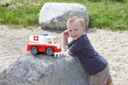 Te openen achterdeuren en een openklapbare cabine zorgen voor realistische speelsituaties zonder batterijen. Kinderen laden de brancard eenvoudig uit en vervoeren de patiënt.
