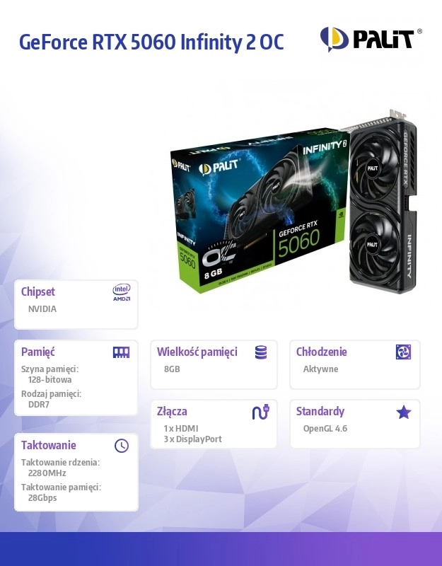 De Palit GeForce RTX 5060 INFINITY 2 OC is gebouwd op moderne NVIDIA-architectuur en richt zich op gamers en makers die prestaties zonder tweaken willen. Het minimalistische uiterlijk met infinity-motief ondersteunt een vlotte luchtstroom en een cleane esthetiek die in de meeste behuizingen past.