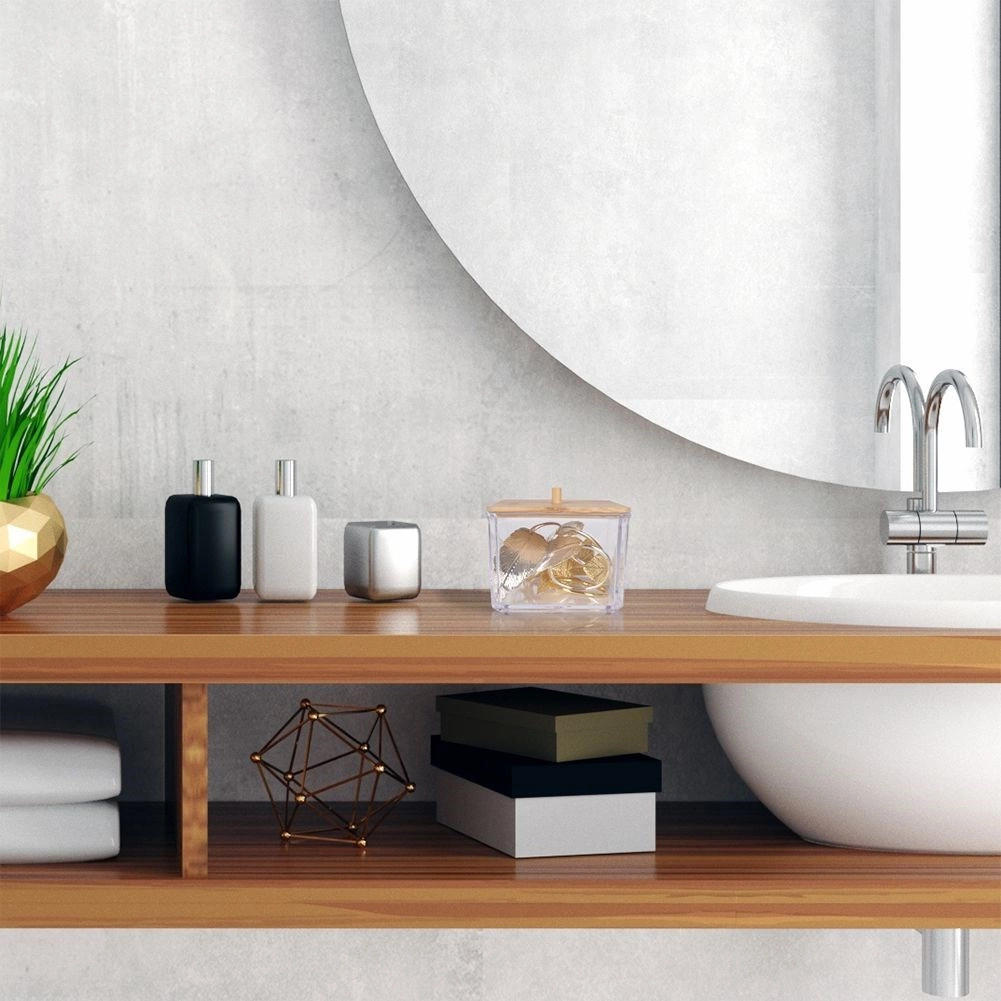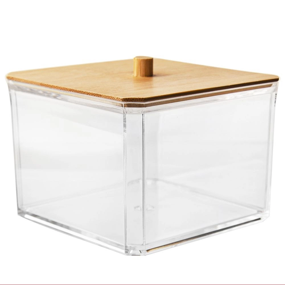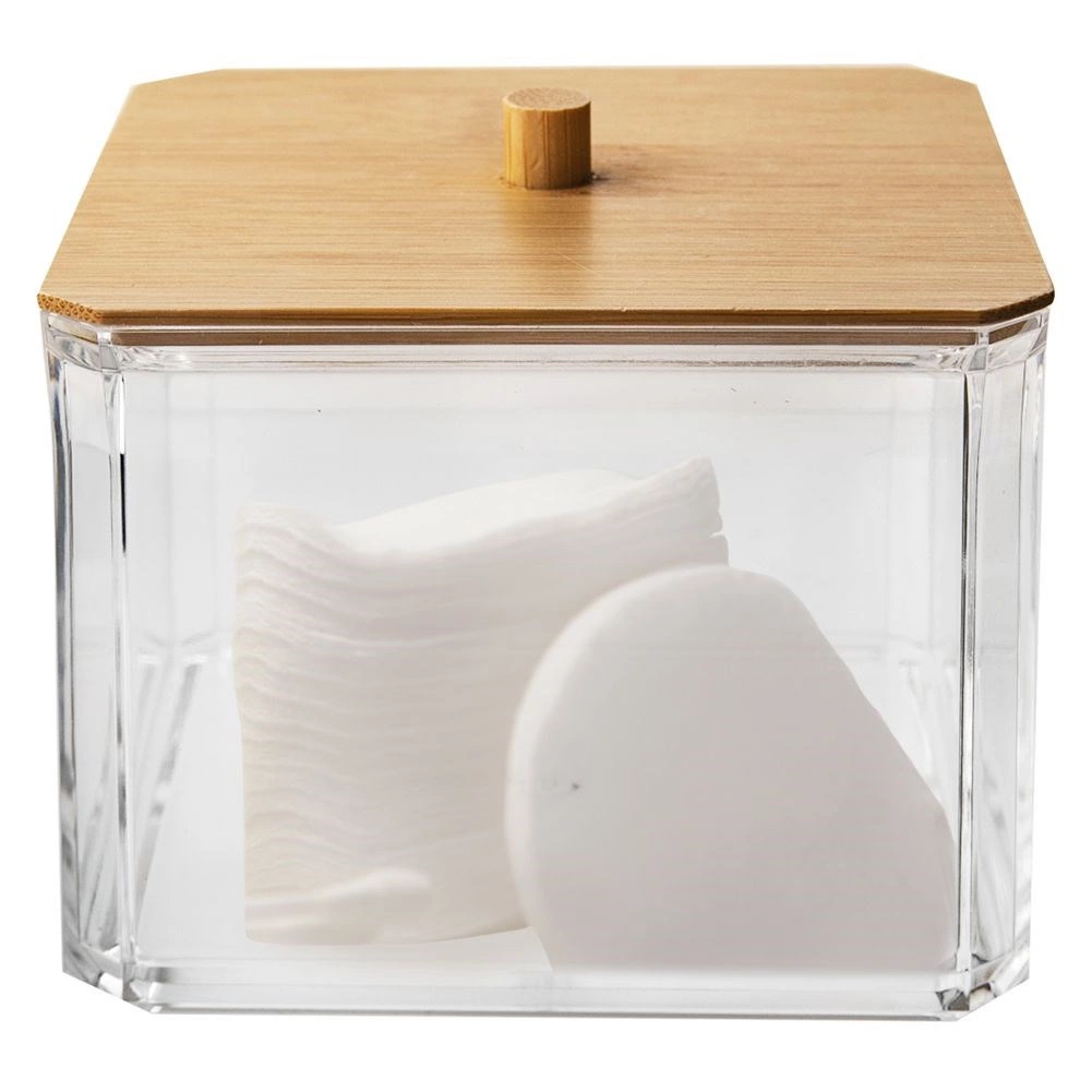 Deze elegante doos voor wattenstaafjes combineert heldere wanden van duurzaam plastic met de natuurlijke uitstraling van een bamboe deksel met praktische knop. Ideaal voor de badkamer, slaapkamer of make-uphoek – houdt kleine items overzichtelijk en stofvrij.