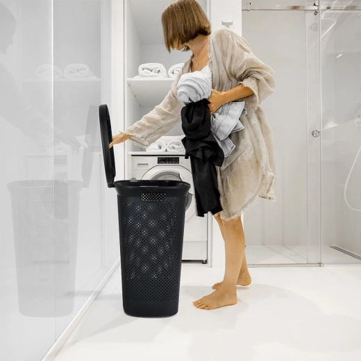 Het scharnierende deksel houdt de inhoud uit het zicht en helpt orde te bewaren in de badkamer of wasruimte. Eenvoudig te openen voor comfortabel inladen van wasgoed.