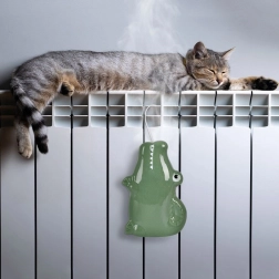 Maak een einde aan droge lucht in huis met stijl. De keramische radiator-luchtbevochtiger in krokodilvorm verhoogt het ademcomfort, verlicht droge slijmvliezen en verbetert het binnenklimaat. Groen geglazuurde keramiek werkt als een decoratief accessoire dat in elk interieur past, vooral in de kinderkamer.
