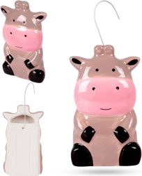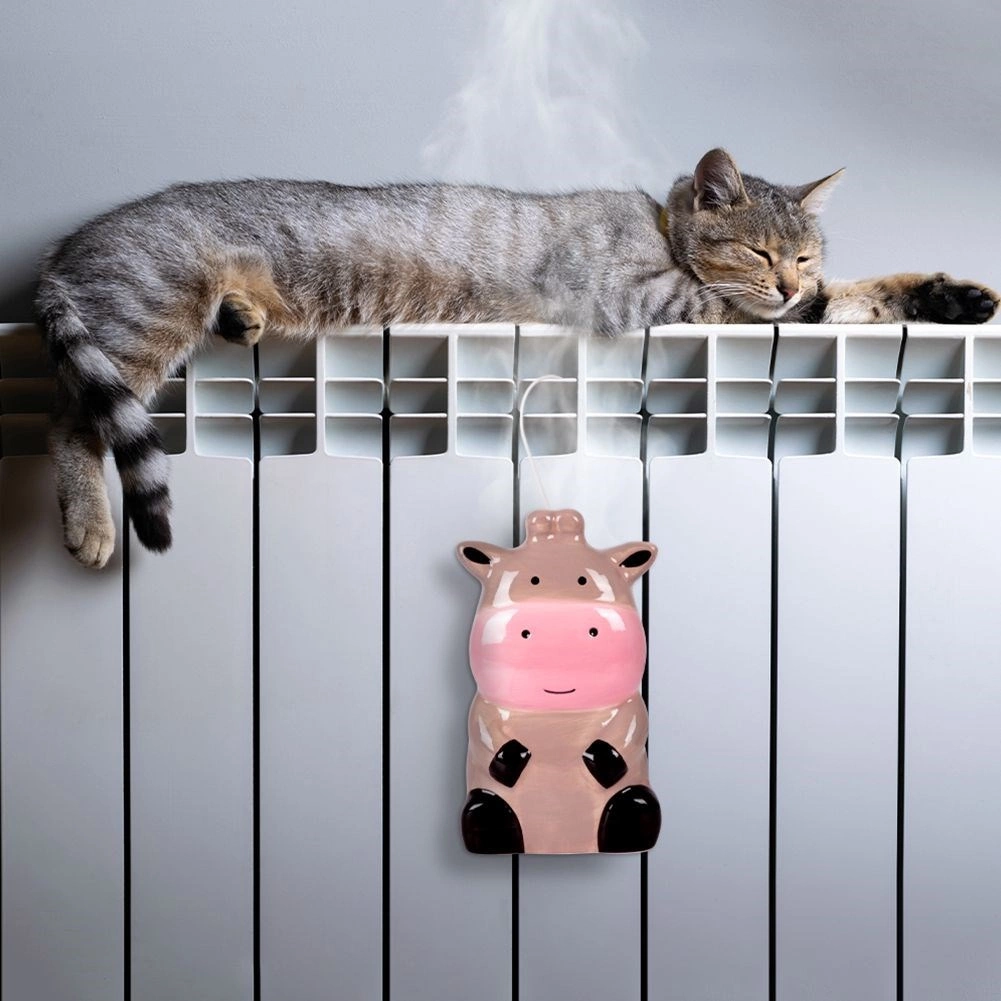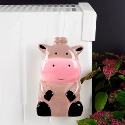 Schattige keramische radiator-luchtbevochtiger in de vorm van een koetje helpt een prettige luchtvochtigheid te behouden tijdens het stookseizoen. Dankzij het eenvoudig ophangen aan een haak en de compacte afmetingen is hij ideaal voor de kinderkamer, slaapkamer en woonkamer. De keramische uitvoering met glanzend glazuur is niet alleen functioneel maar ook decoratief.
