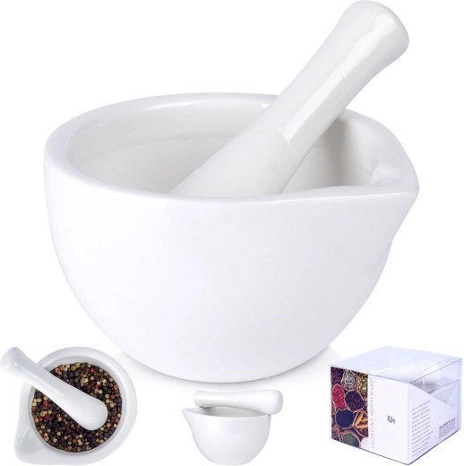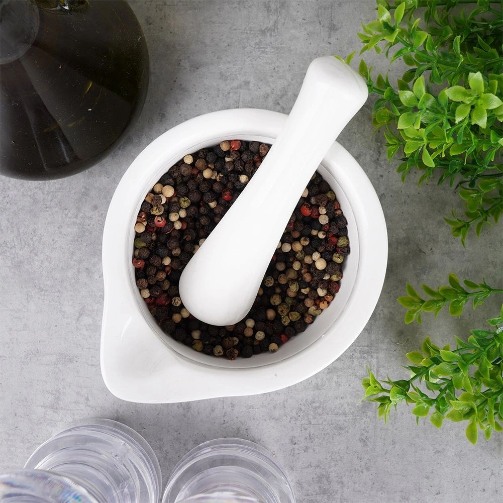 Deze witte porseleinen vijzel is een ideale keuze voor thuiskoks en liefhebbers van gastronomie die het maximale uit de smaak en aroma van specerijen en kruiden willen halen. Dankzij het on-gepolijste binnenoppervlak vermaalt hij efficiënt ook hardere ingrediënten en kun je verse pesto, aromatische melanges of huisgemaakte curry bereiden.