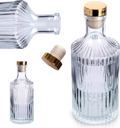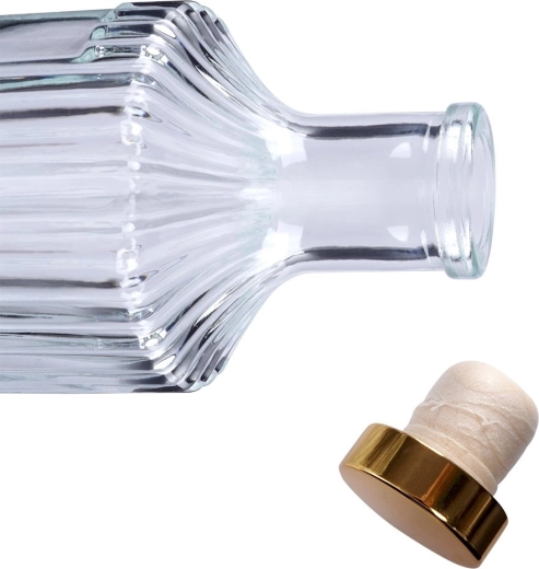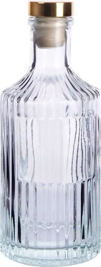 Stijlvolle fles van helder glas met een modern geribbeld design en een decoratieve gouden kurk, geschikt voor het serveren en bewaren van dranken. De compacte afmetingen maken het hanteren en opbergen in koelkast of op plank eenvoudig. De fles is gemakkelijk te reinigen en geschikt voor dagelijks gebruik in huishoudens en horeca.