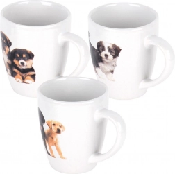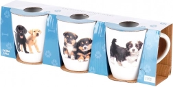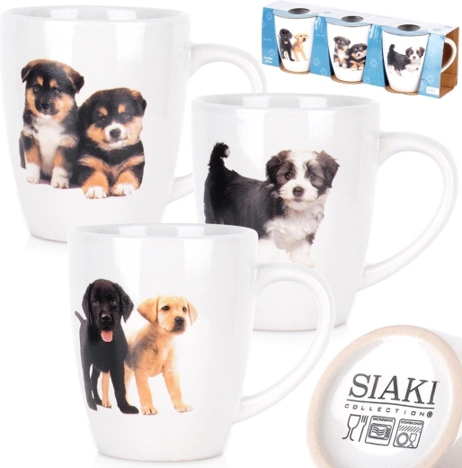 Verwen jezelf met een set van drie keramische mokken met een lief hondenmotief die je ochtendkoffie en middagthee opvrolijken. Dankzij het compacte volume van 220 ml zijn ze ideaal voor espresso lungo, cappuccino, cacao en kruidenthee. De mokken zijn gemaakt van hoogwaardig wit keramiek met een duurzame puppy‑print en een glanzende glazuur.