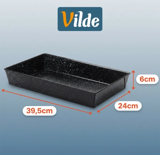 Praktische rechthoekige bakvorm van 39,5 × 24 × 6 cm van koolstofstaal met een granieten anti-aanbaklaag. Geleidt warmte uitstekend voor een gelijkmatige garing en is geschikt voor gas- en elektrische ovens tot 230 °C. Ideaal voor taarten, cakes, ovenschotels, vlees en groenten. Voedselveilig en geschikt voor dagelijks gebruik.