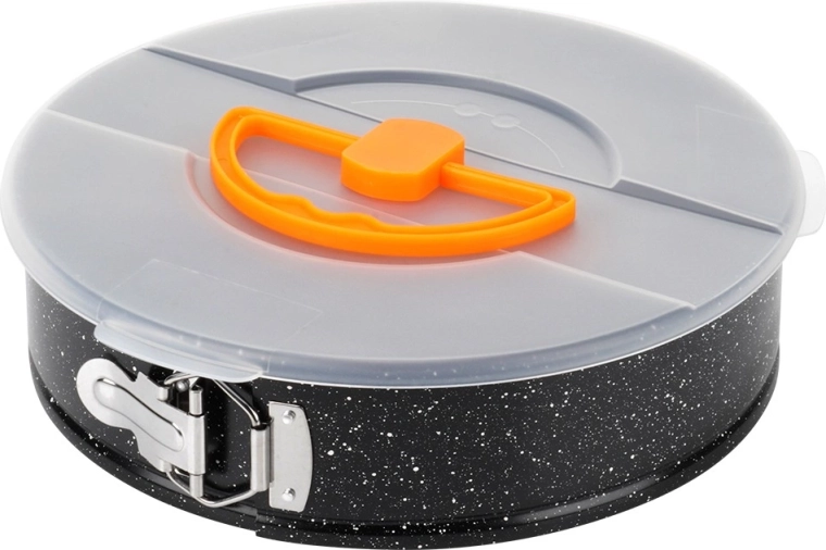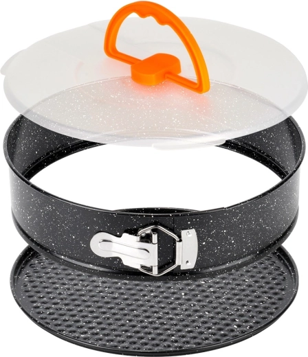 Praktische ronde taartvorm van duurzame staal met granietcoating voor egale baktijden en gemakkelijk lossen van bodems. De springrand, het uitneembare bodemblad en het kunststof deksel met handgreep zorgen voor comfortabel bakken, bewaren en vervoeren van taarten en cheesecakes.