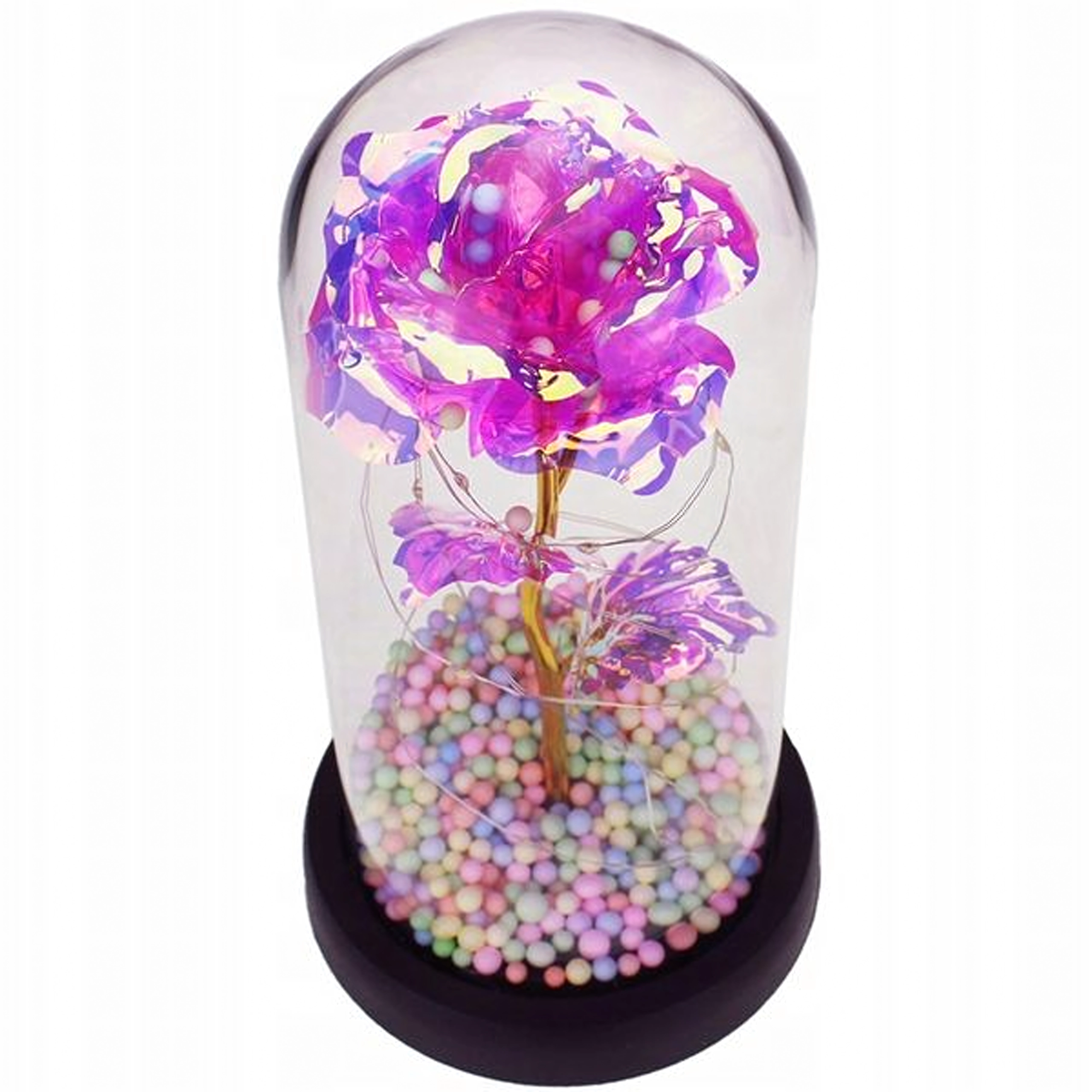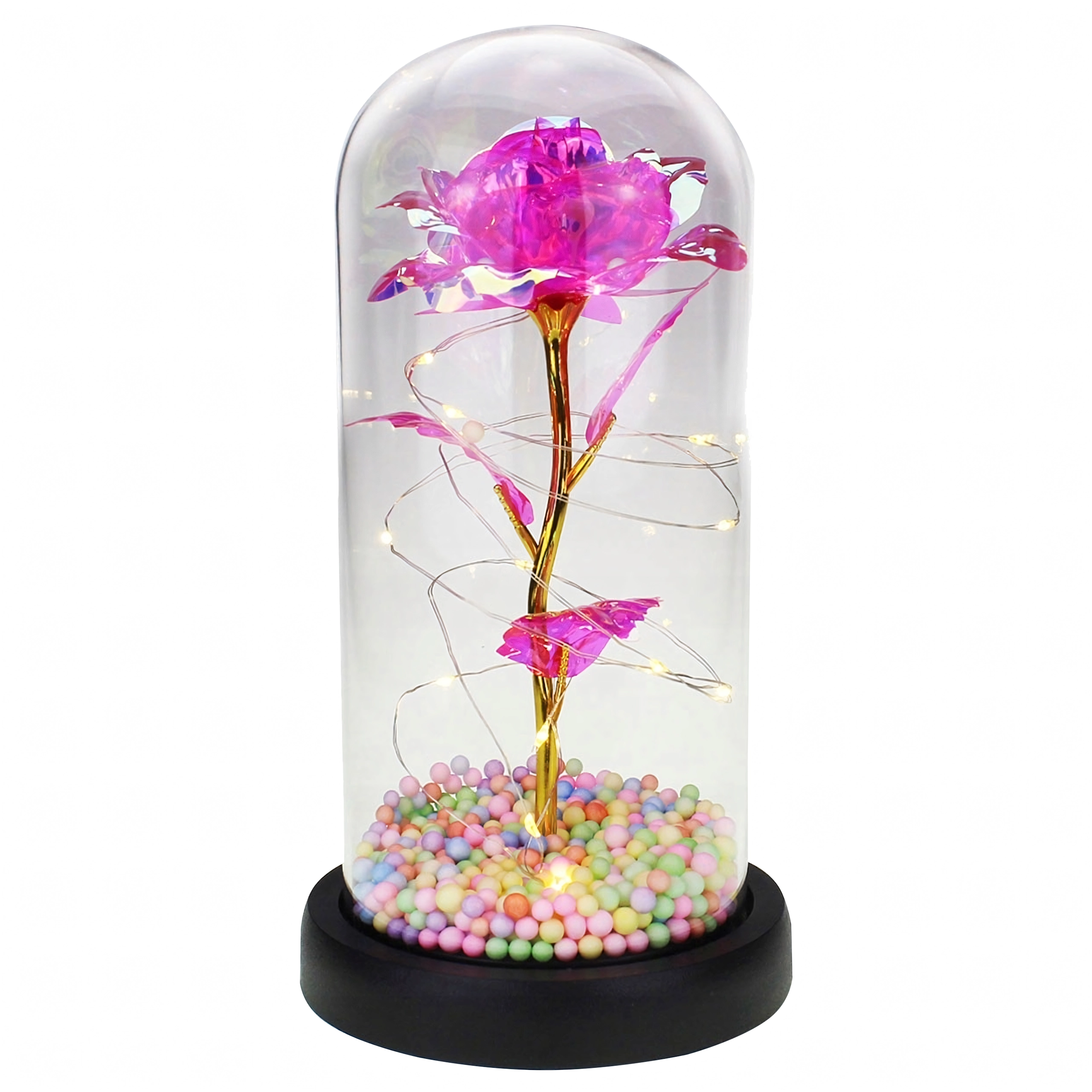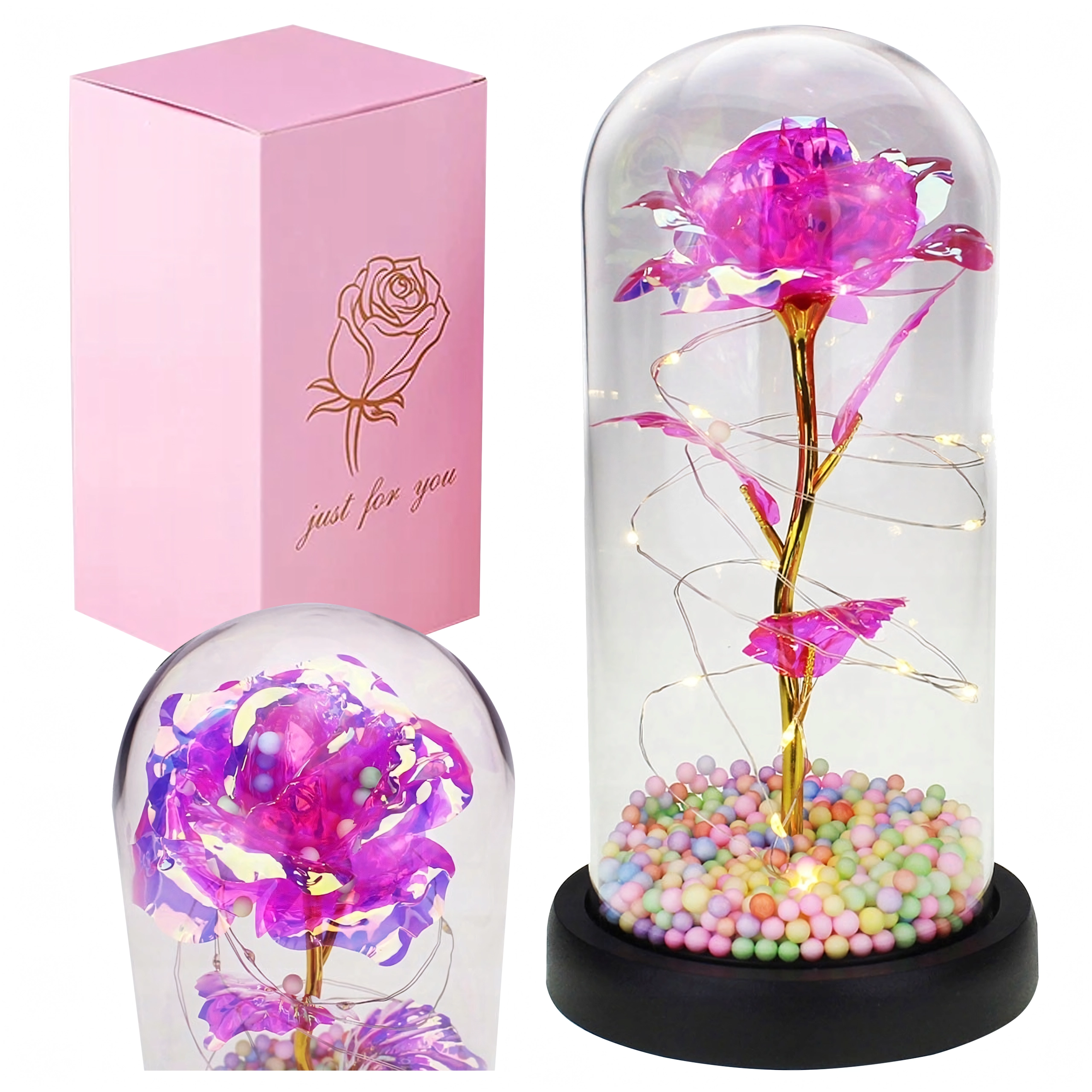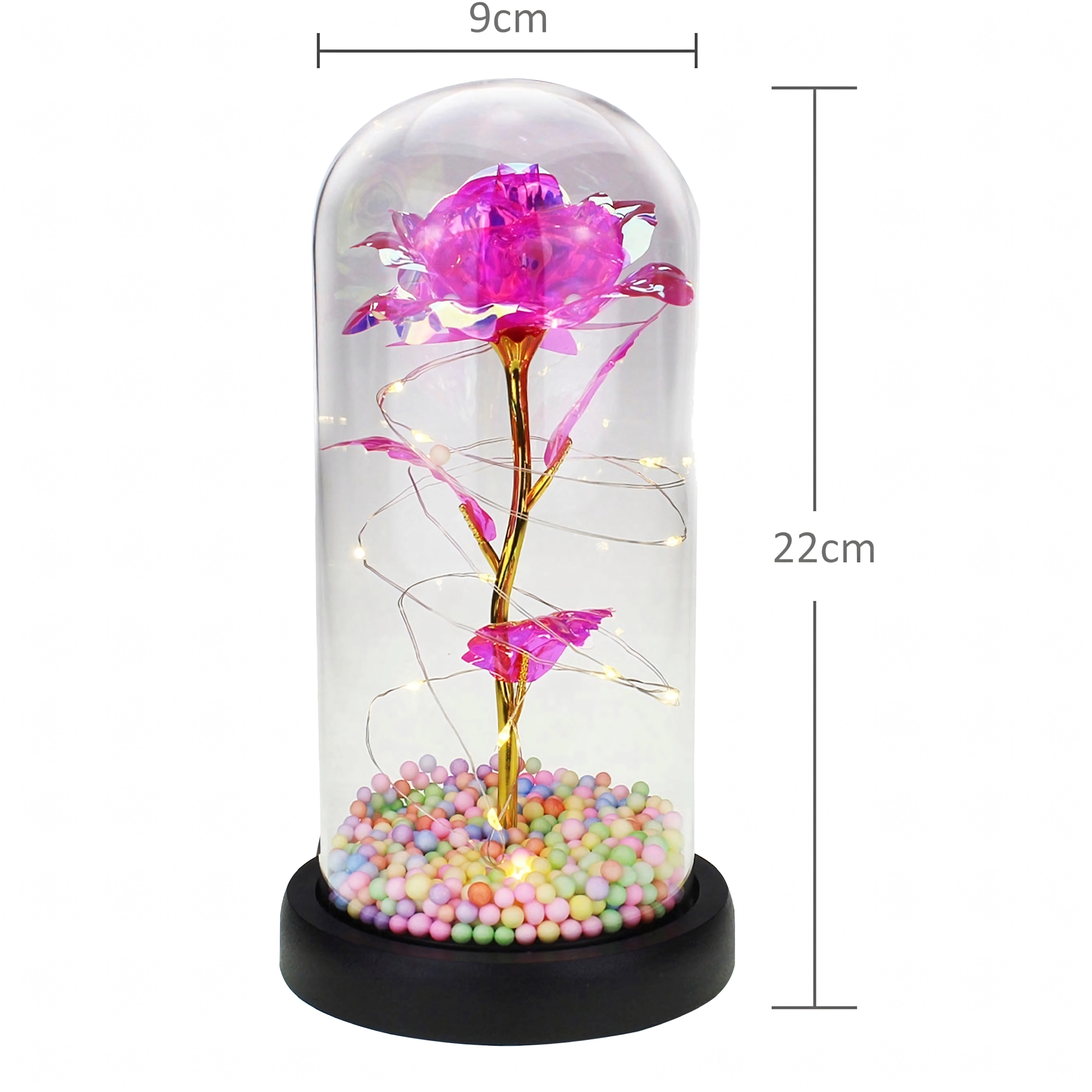 De elegante LED-roos onder een glazen stolp verlicht elk interieur met warm, sprankelend licht. Ze combineert moderne LED-verlichting met het tijdloze symbool van liefde – de roos – en vormt zo een indrukwekkende woonaccessoire en een onvergetelijk cadeau. De stolp beschermt de bloem tegen stof en benadrukt haar zachte gloed.