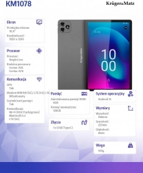 De moderne tablet KRÜGER&MATZ Eagle 1078S biedt een 11" IPS‑display met een resolutie van 1920 × 1200, 90Hz soepelheid, een krachtige 8‑core MediaTek‑processor en 8 GB RAM voor snel werken en entertainment. Met 256 GB opslag (uitbreidbaar via microSD), LTE, Wi‑Fi ac, Bluetooth 5.2 en een 7000 mAh batterij is hij klaar voor de hele dag gebruik, videogesprekken en multimedia.