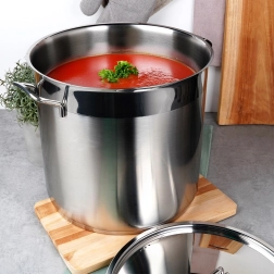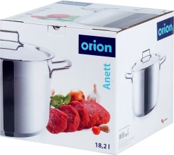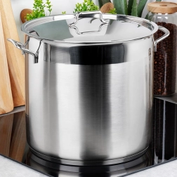 De grote RVS kookpan ANETT met een inhoud van 18 l en stevig deksel is ideaal voor het koken van soepen, bouillons en het stoven van grote porties. Dankzij hoogwaardige 18/10-staal, een meerlaagse akutermische bodem en compatibiliteit met alle soorten kookplaten, inclusief inductie zorgt hij voor een snelle en gelijkmatige warmteverdeling. Robuuste wanden, comfortabele grepen en eenvoudig onderhoud in de vaatwasser maken het een betrouwbare hulp voor zowel de thuis- als professionele keuken.