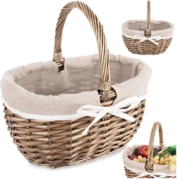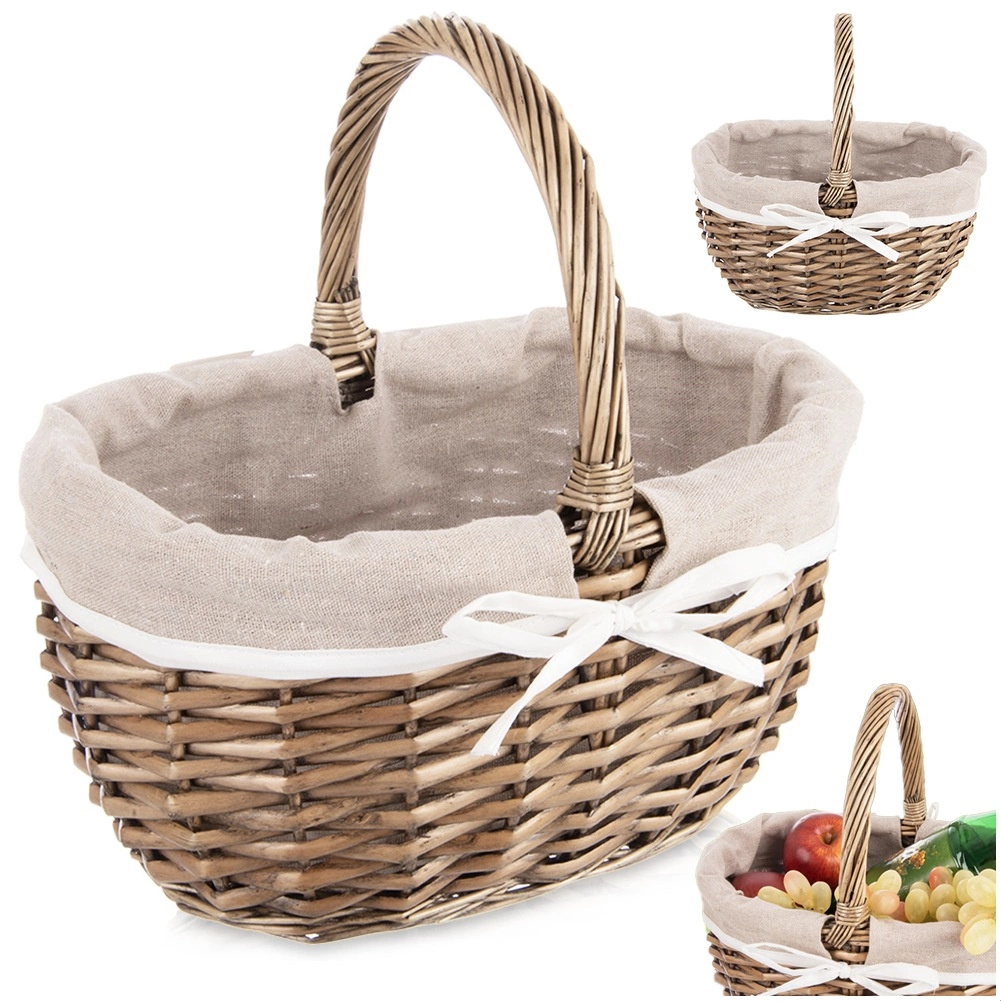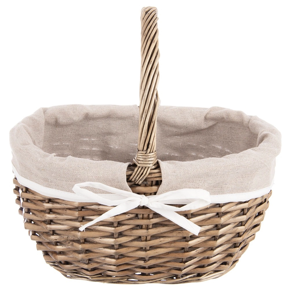 Elegante rieten mand met een stevige handgreep en een uitneembare stoffen voering, ideaal voor picknicks, boodschappen en thuisopslag. Handgevlochten van natuurlijke wilg voor duurzaamheid en een unieke uitstraling. De beige textiele voering met witte strik geeft de mand flair en kan eenvoudig gewassen worden. Praktische afmetingen 32,5 × 24 × 32 cm maken dragen en organiseren gemakkelijk.
