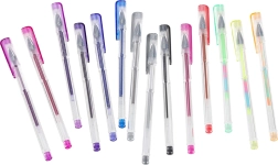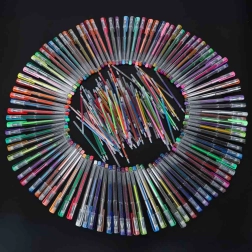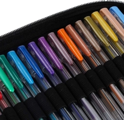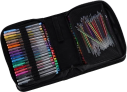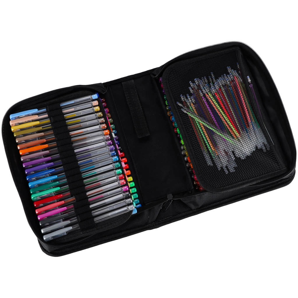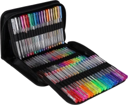 Ontdek de universele set voor school, kantoor en vrije tijd: 100 gelpennen in een rijke kleuren- en effectenpalet, plus 100 reservevullingen. Het overzichtelijke opvouwbare etui met rits houdt elke pen op zijn plek, zodat je alle kleuren altijd bij de hand en veilig opgeborgen hebt.