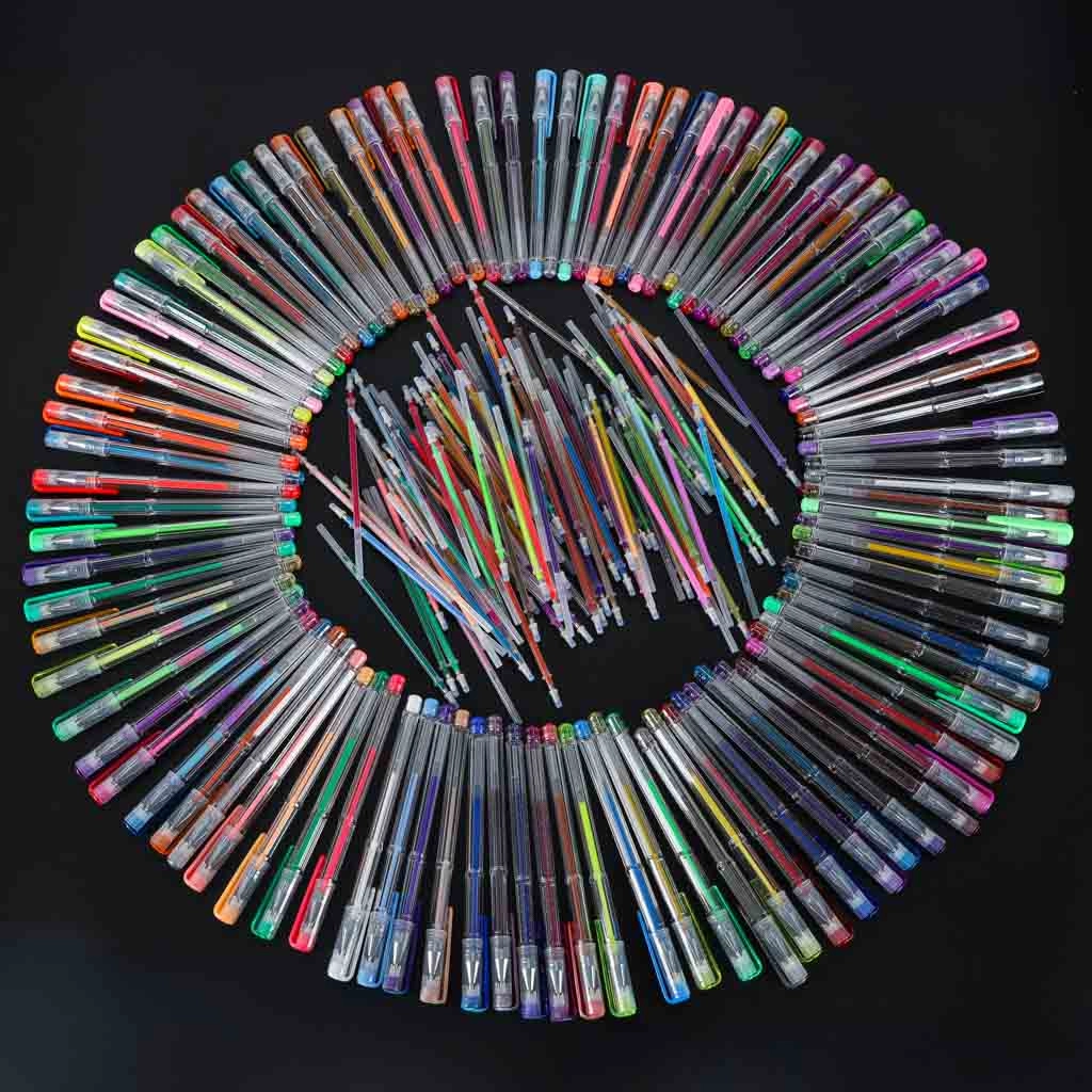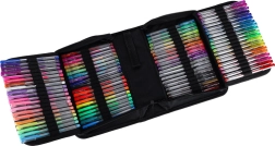 Grote set gekleurde gelpennen met verwisselbare vullingen in een praktisch etui met rits. Bevat 100 gelpennen met verschillende effecten en 100 navullingen voor een lange levensduur. Een uitstekende keuze voor schrijven, journaling, kalligrafie en creatief tekenen – alles overzichtelijk opgeborgen in een opvouwbaar etui.