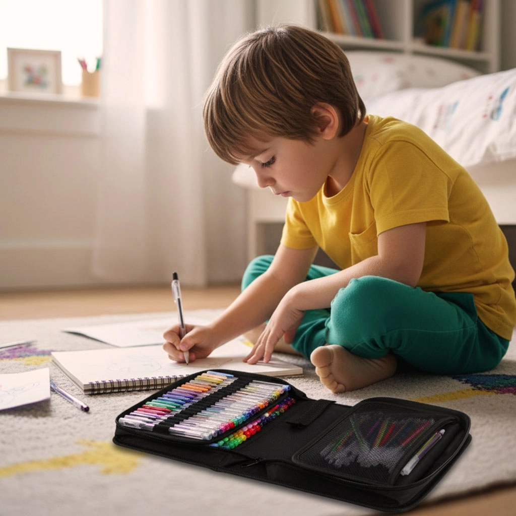 Het uitklapbare etui met elastische lussen houdt de pennen geordend en beschermd. Zo neem je ze gemakkelijk overal mee naartoe.