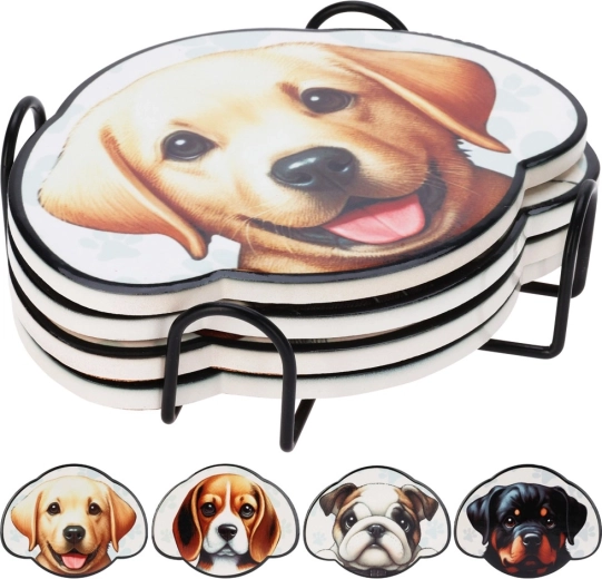 Stijlvolle set van vier onderzetters met hondenmotieven en een praktische metalen houder. Elke onderzetter is gemaakt van duurzaam dolomiet met een onderlaag van kurk ter bescherming van oppervlakken. Beschermt de tafel tegen vlekken en krassen, neemt weinig ruimte in en past perfect in keuken, eetkamer en kantoor.